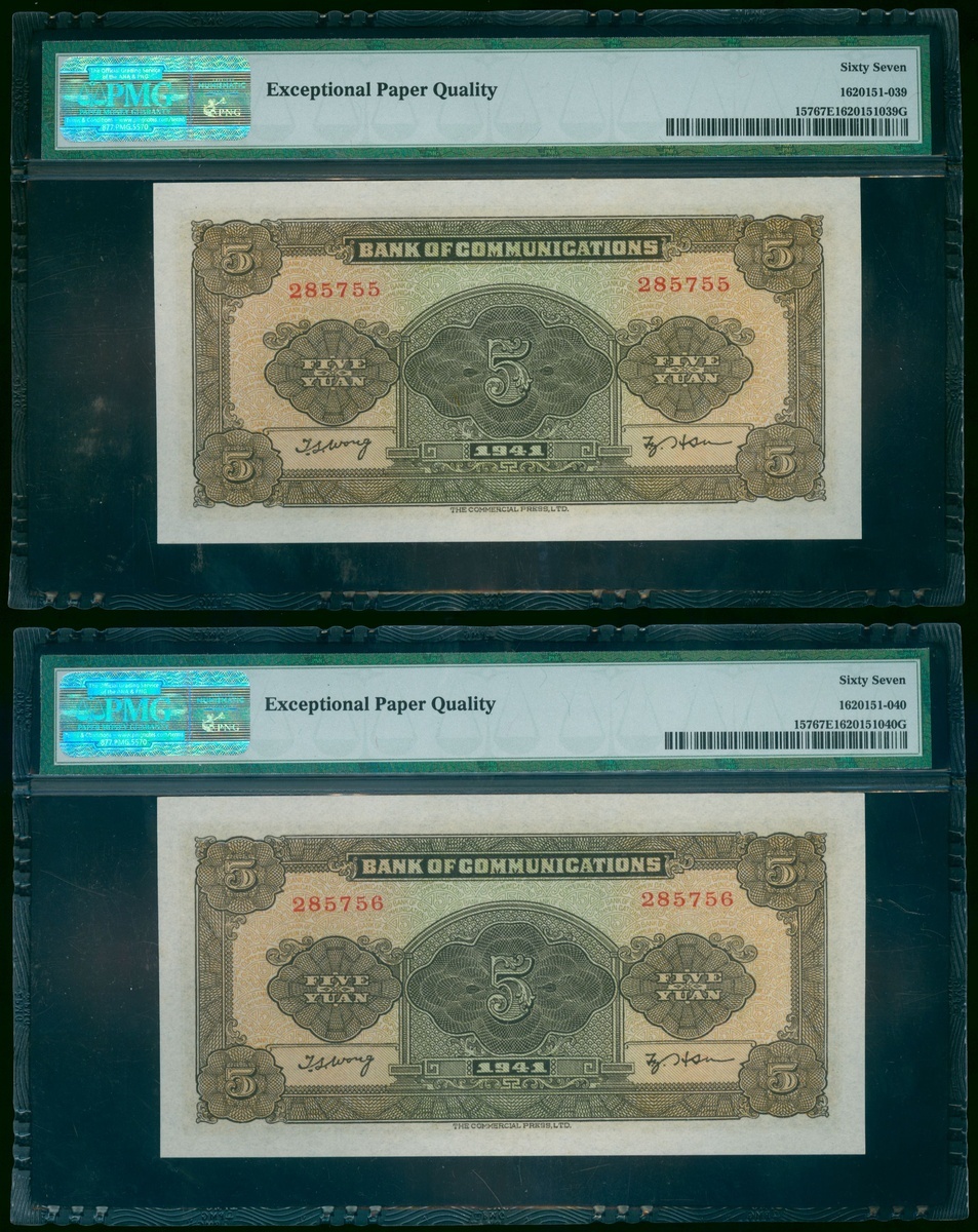 Bank of Communications, a pair of 5 yuan, Year 30 (1914), consecutive serial numbers 285755 and 285756, (Pick 157), both graded PMG 67EPQ Superb Gem Uncirculated (2).