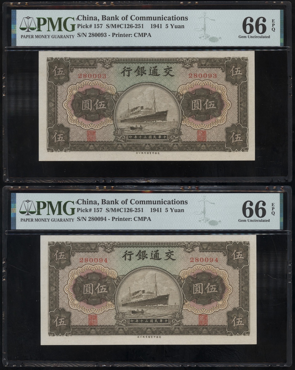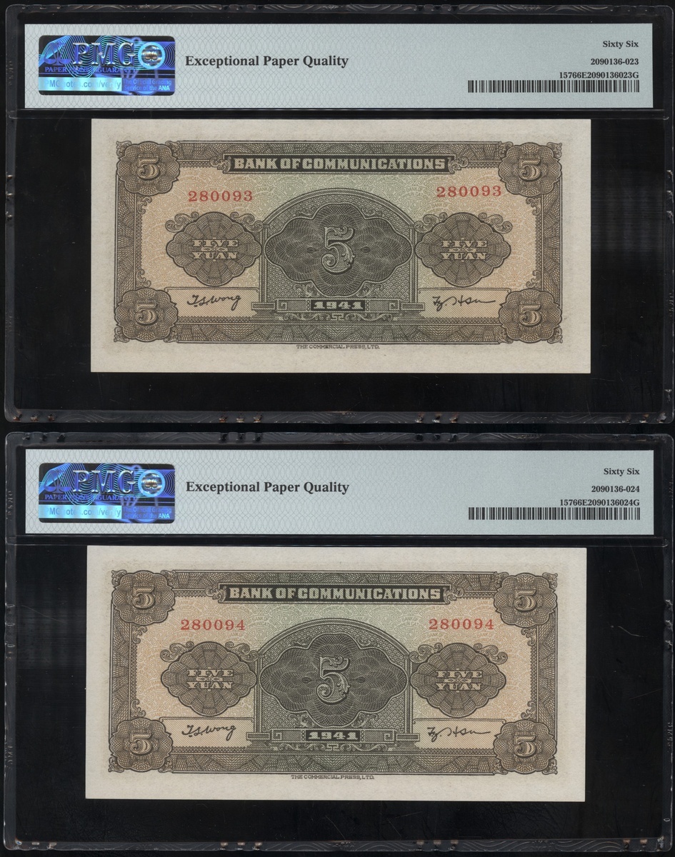 Bank of Communications, a consecutive pair of 5 yuan, Year 30(1941), serial numbers 280093-94, (Pick 157), both graded PMG 66EPQ Gem Uncirculated (2).