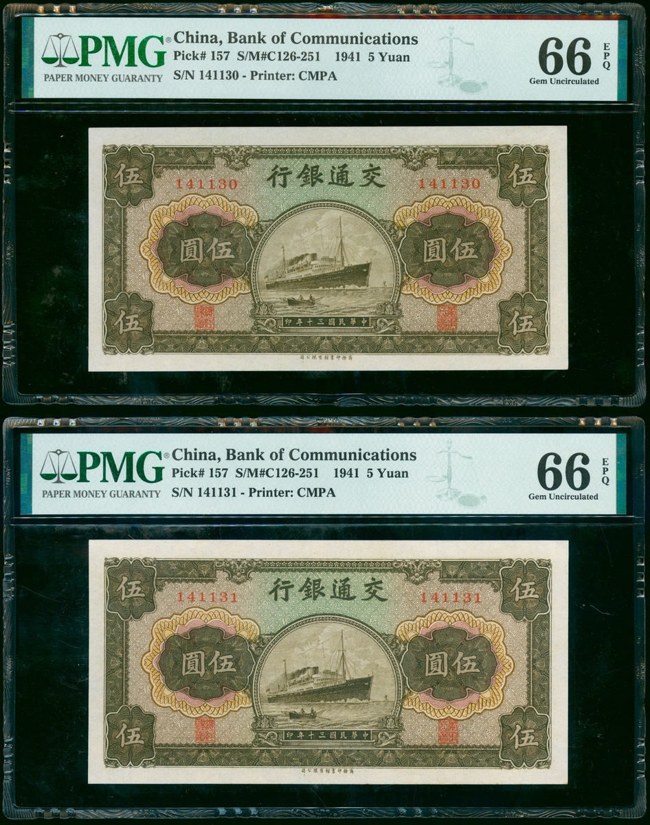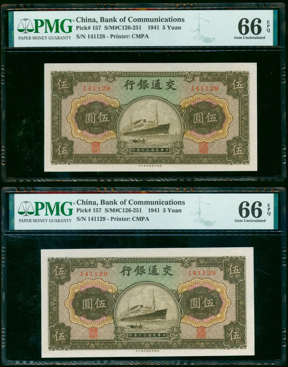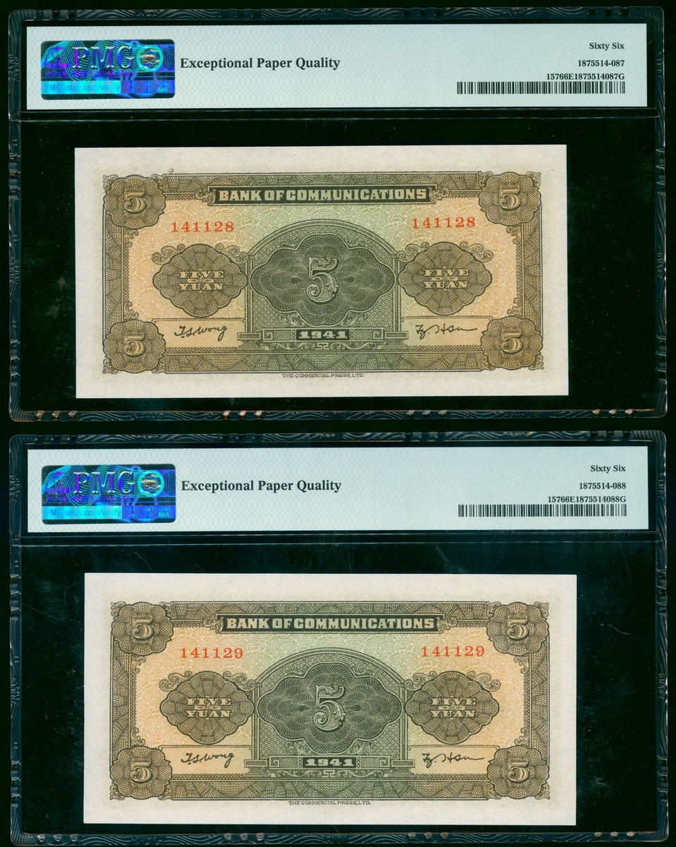 Bank of Communications, a quartet of 5 yuan, Year 30 (1941), consecutive serial numbers 141128 to 31, (Pick 157), all graded PMG 66EPQ Gem Uncirculated (4).