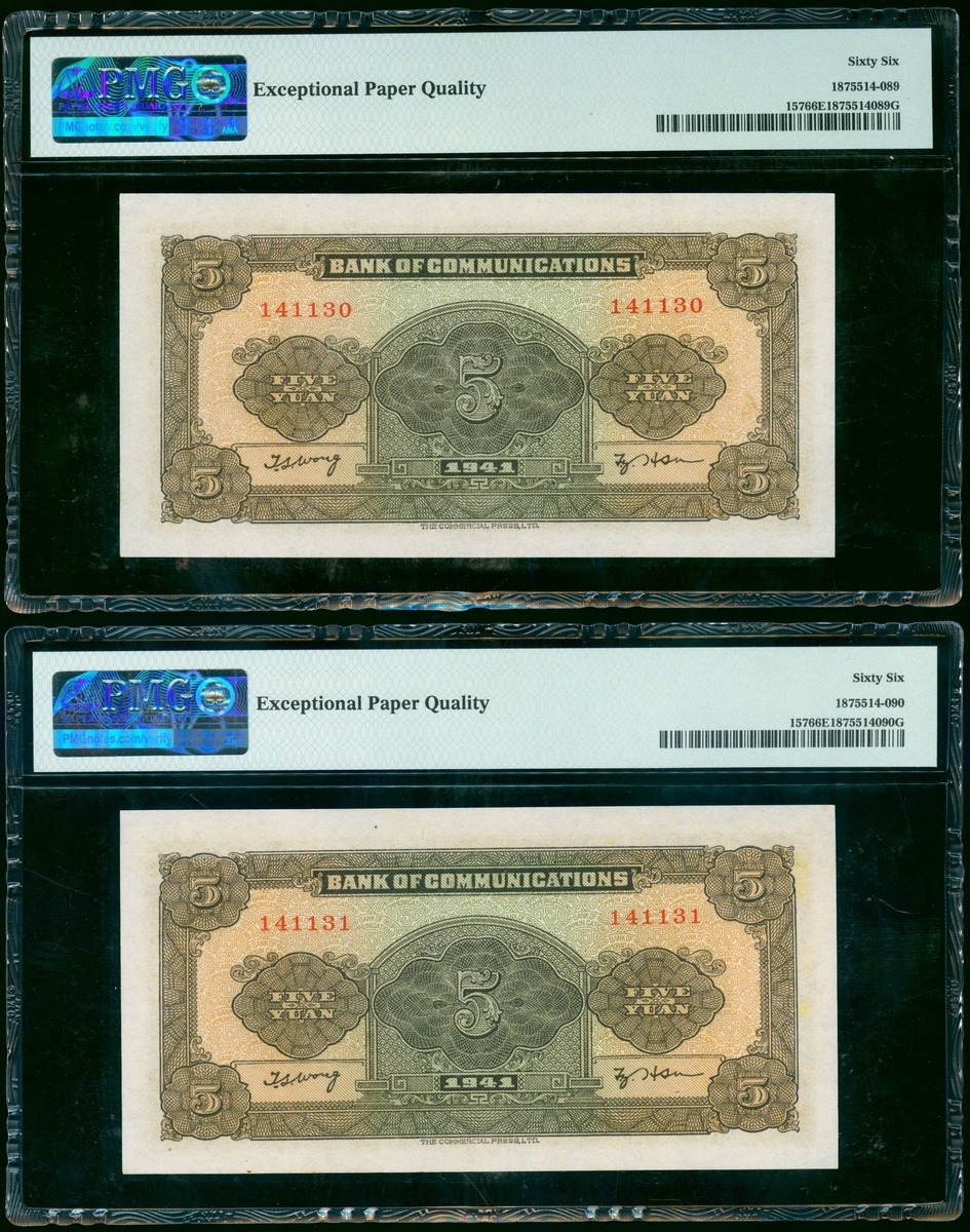 民國三十年(1941)交通銀行伍圓一組4枚,連號141128-31,均評PMG 66EPQ