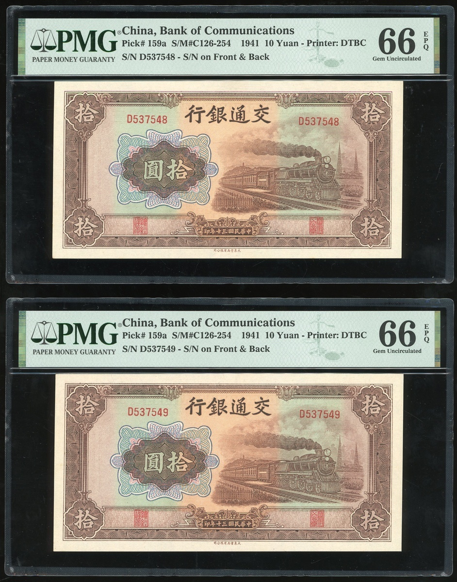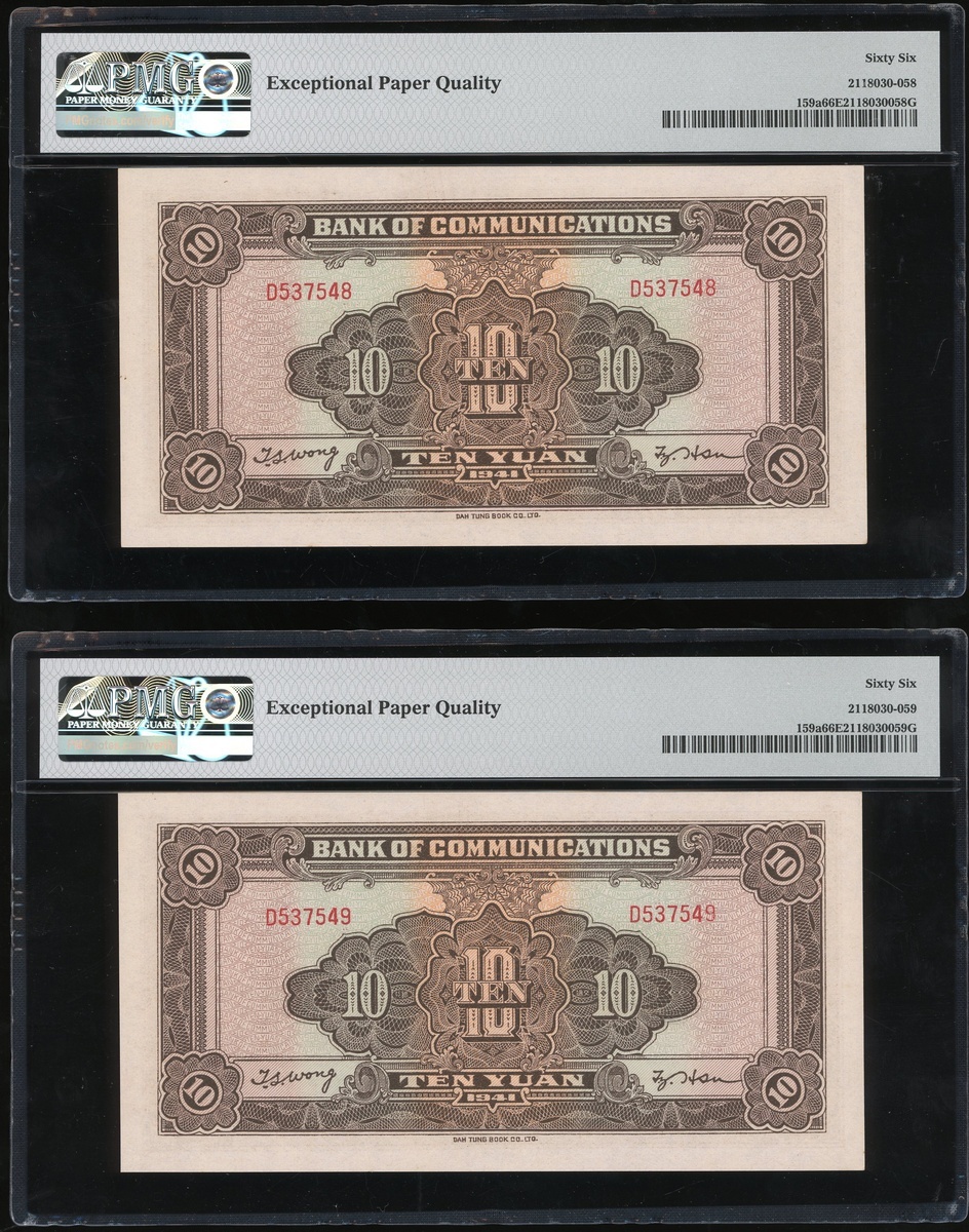 Bank of Communications, a pair of 10 yuan, year 30 (1941), consecutive serial numbers D537548-549, (Pick 159a), both graded PMG 66EPQ Gem Uncirculated (2)
