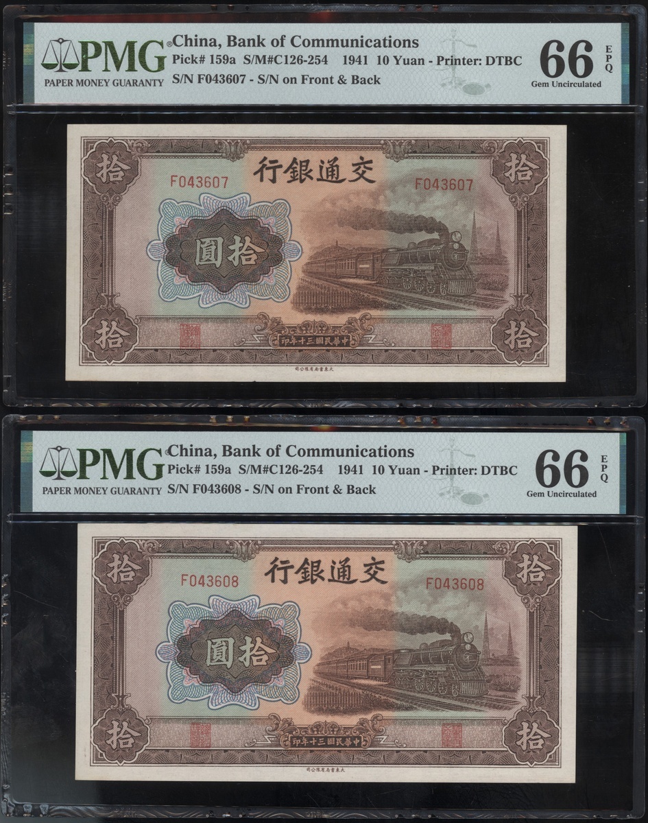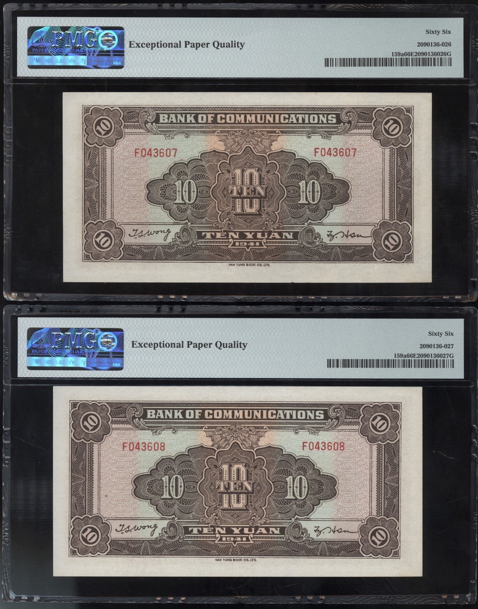 Bank of Communications, a consecutive pair of 10 yuan, Year 30(1941), serial numbers F043607-08, (Pick 159a), both graded PMG 66EPQ Gem Uncirculated (2).