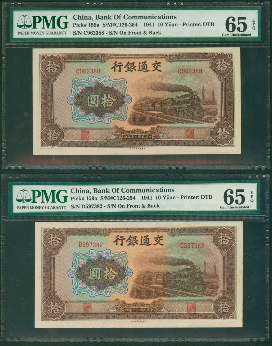 Bank of Communications, a pair of 10 yuan, Year 30 (1941), serial numbers C962388, and D597382, (Pick 159a), both graded PMG 65EPQ Gem Uncirculated (2).