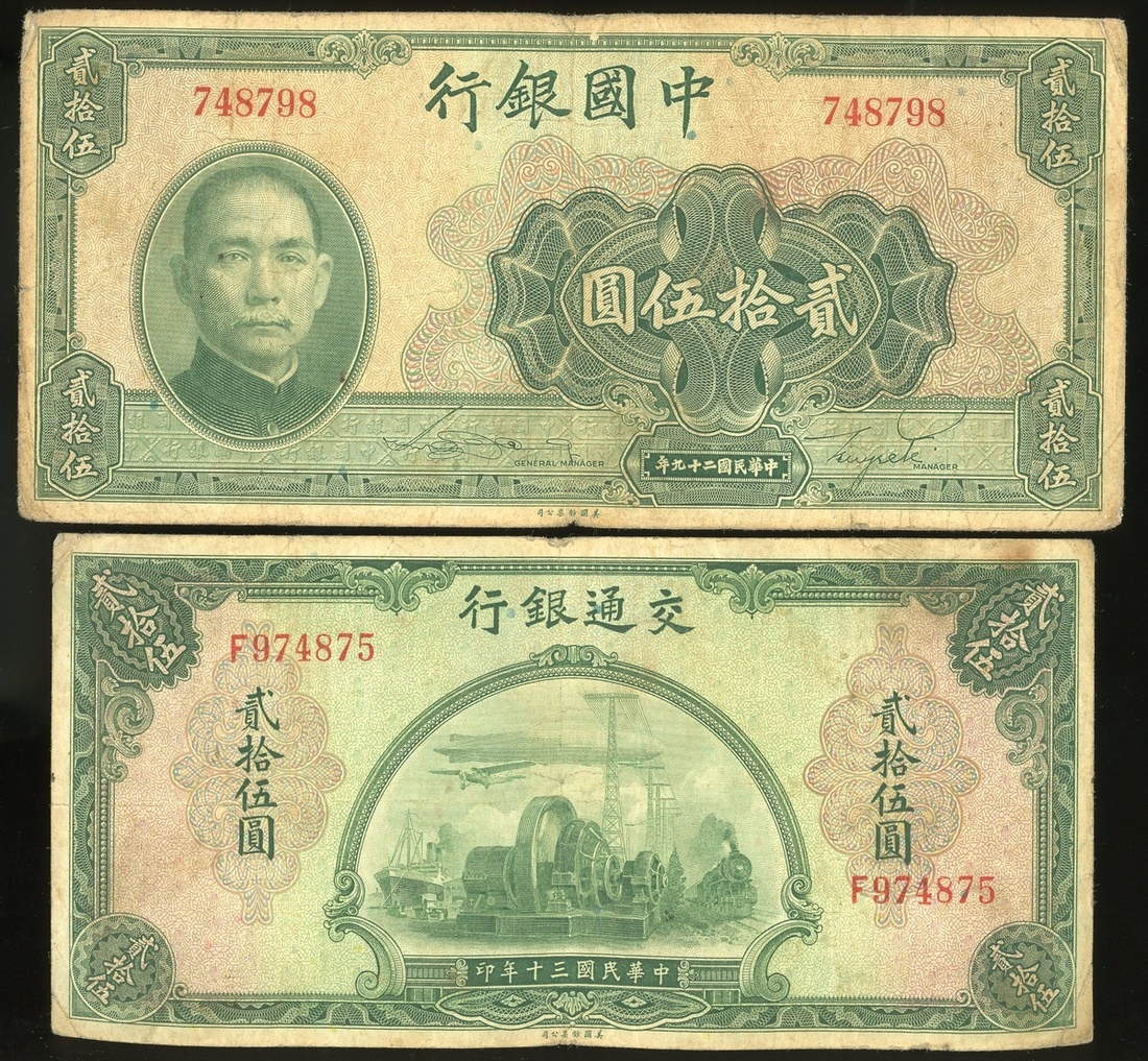 民國時期紙幣一組兩枚,民國二十九年中國銀行貳拾伍圓,及民國三十年交通銀行貳拾伍圓,均F