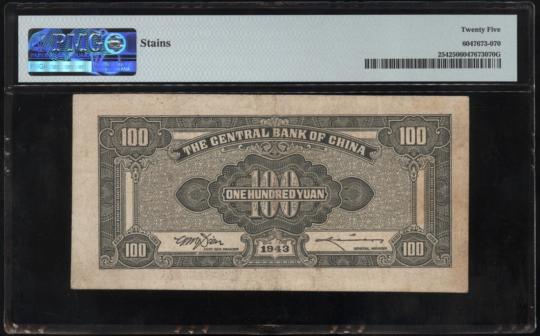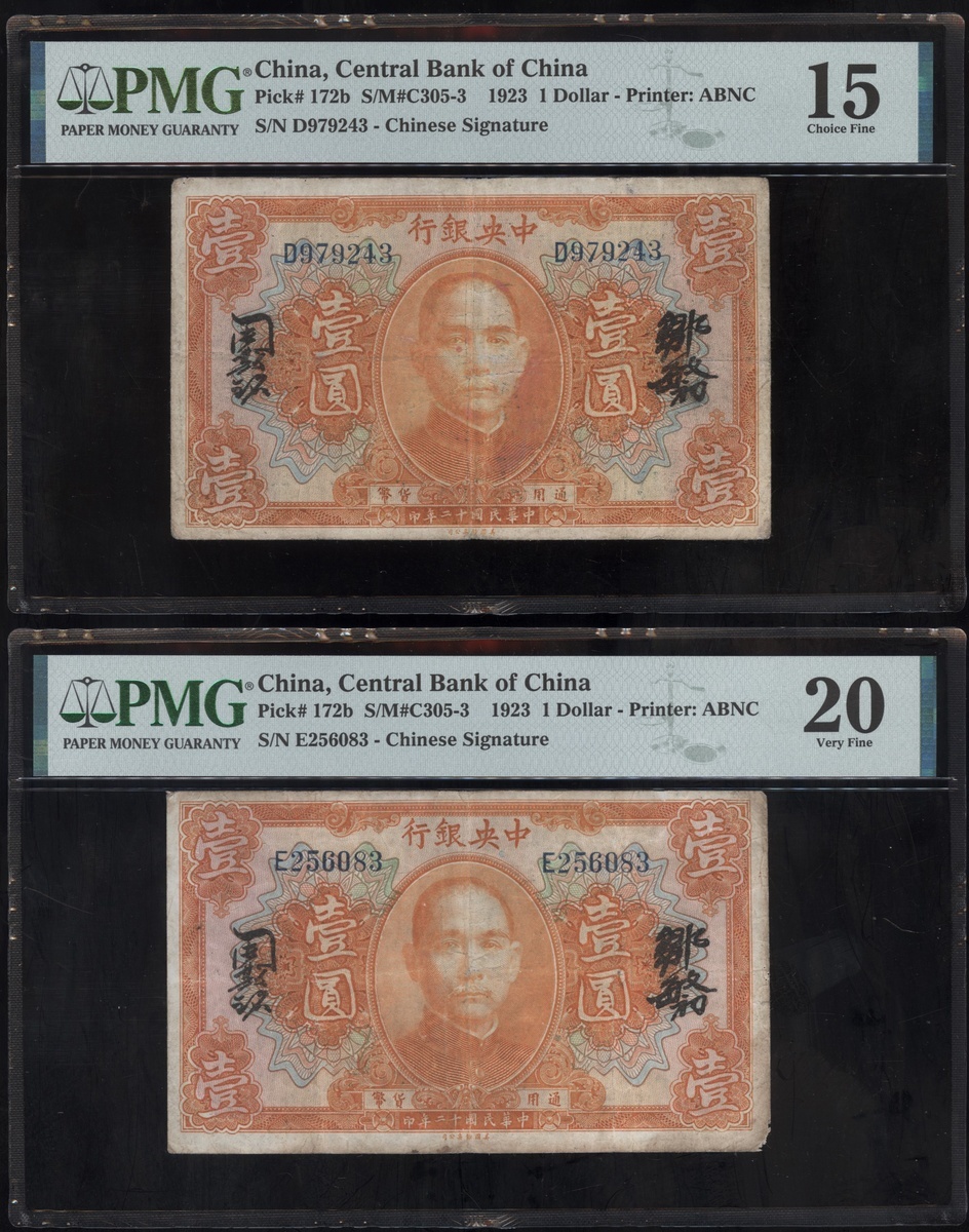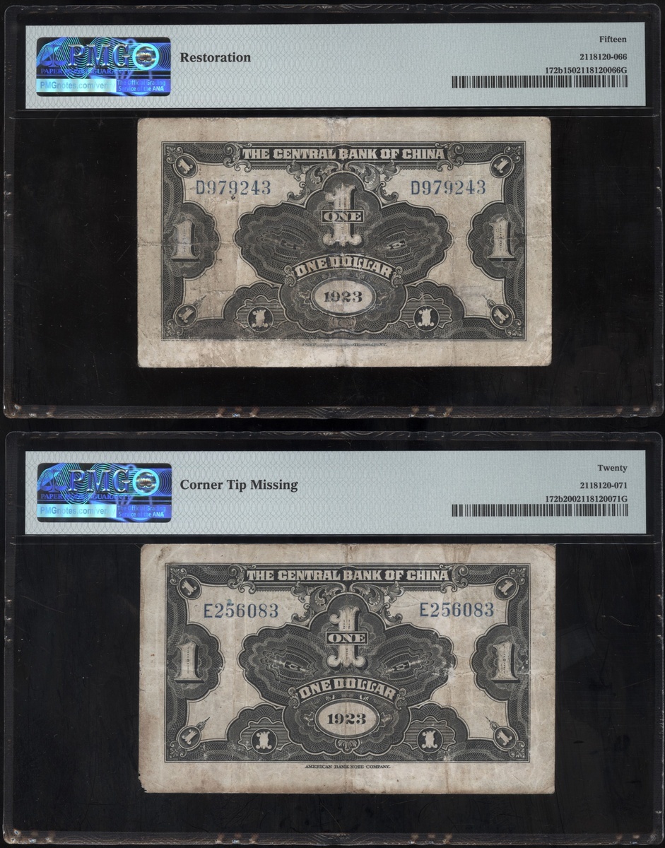 Central Bank of China, (Pick 172b and 254), graded PMG 15 (Restoration), 20 (Corner Tip Missing) and 25 (Very FIne) respectively (3)