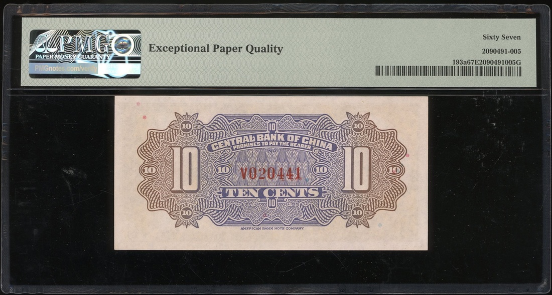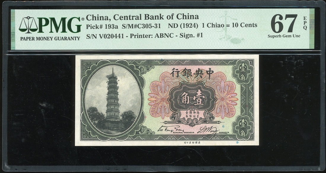1924年中央銀行壹角,編號V020441,宋子文簽,PMG 67EPQ