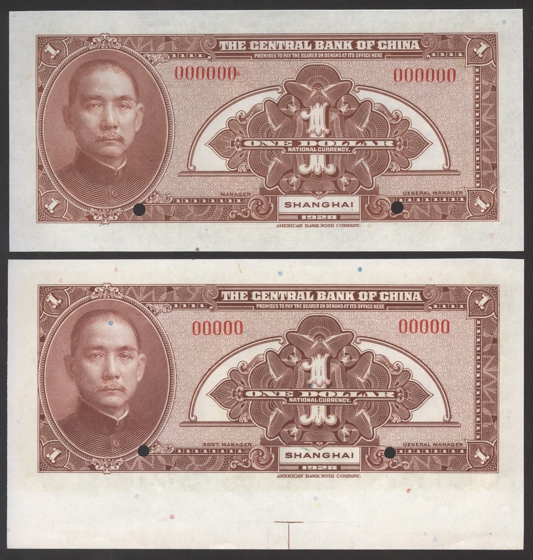 民國十七年中央銀行壹圓樣票一組兩枚,上海地名,編號00000及000000,均UNC