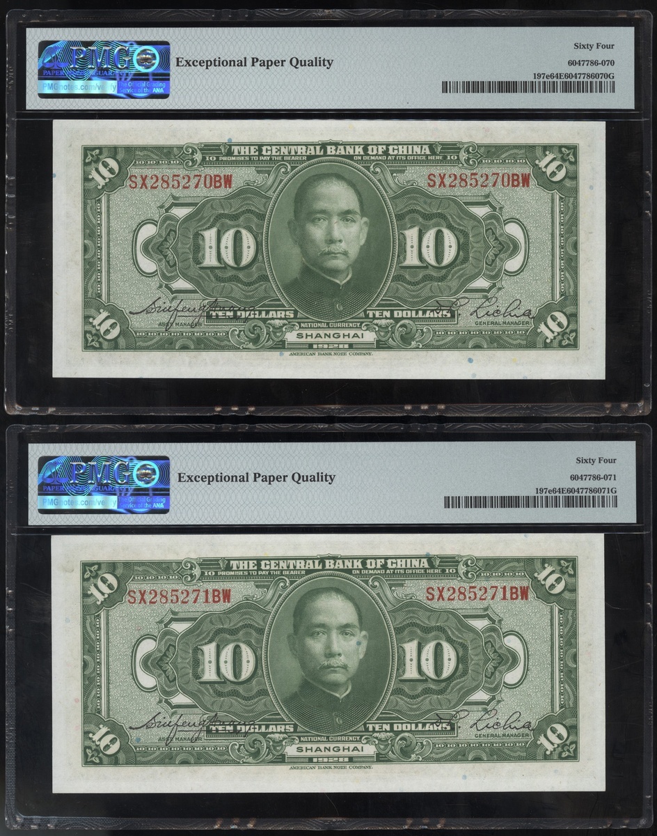 民國十七年中央銀行拾圓一組兩枚,上海地名,編號SX285286BW及SX285294BW,均PMG 64