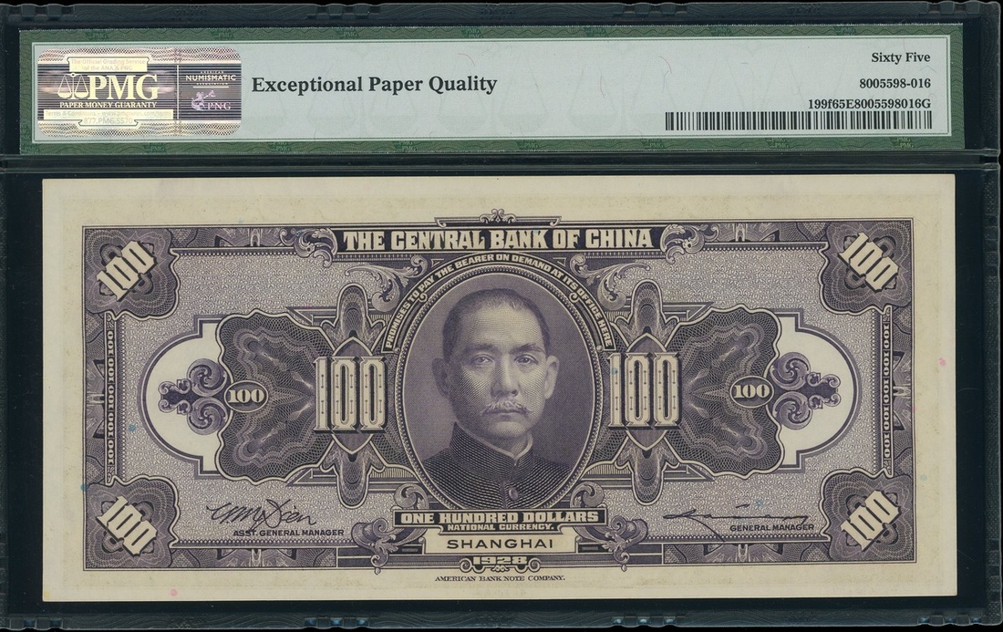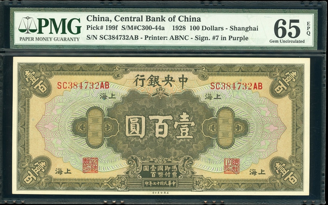 Central Bank of China, 100 yuan, Shanghai, 1928, serial number SC384732AB, (Pick 199f), PMG 65EPQ Gem Uncirculated