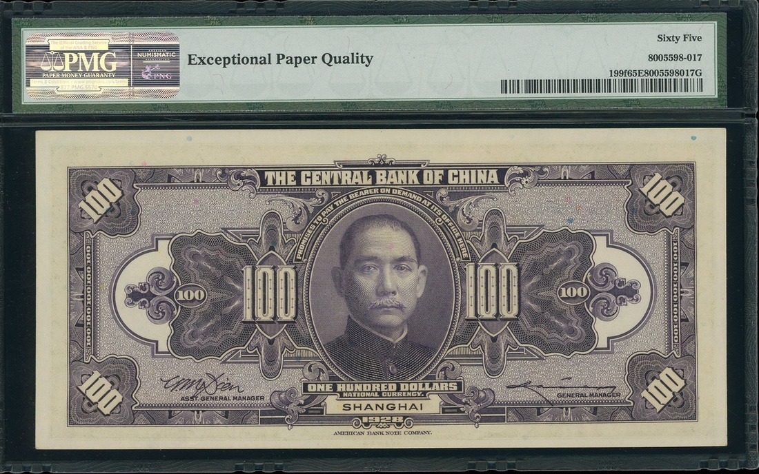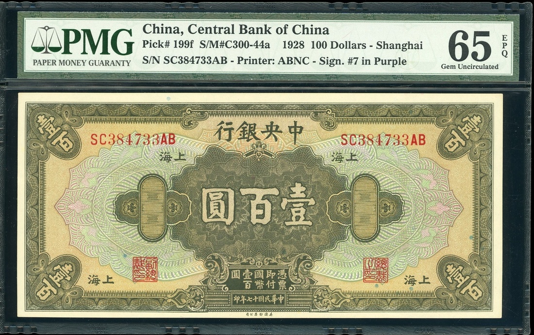 Central Bank of China, 100 yuan, Shanghai, 1928, serial number SC384733AB, (Pick 199f), PMG 65EPQ Gem Uncirculated