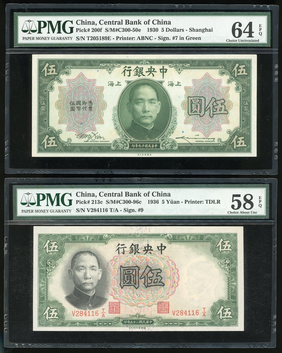 Central Bank of China, a group of 4x 5 Yuan, 1930 and 1936, serial numbers T205189E and V284116T/A, both green, Sun Yat-sen on obverse, a pair of 5 Yuan, 1930, Shanghai, serial numbers L871439A and P099351F, green, Sun Yat-sen at centre, the second note overprinted as a war souvenir, (Pick 200f, 213c), (Pick 200d, 200f), PMG 58EPQ Choice About Uncirculated-64EPQ Choice Uncirculated (2)PMG 30 Very Fine-55 About Uncirculated (2)