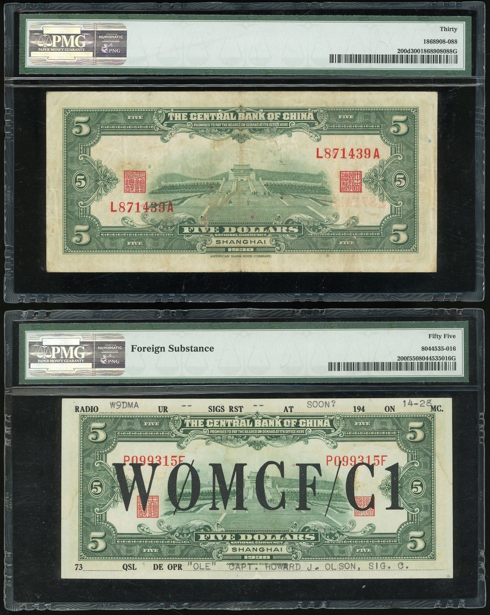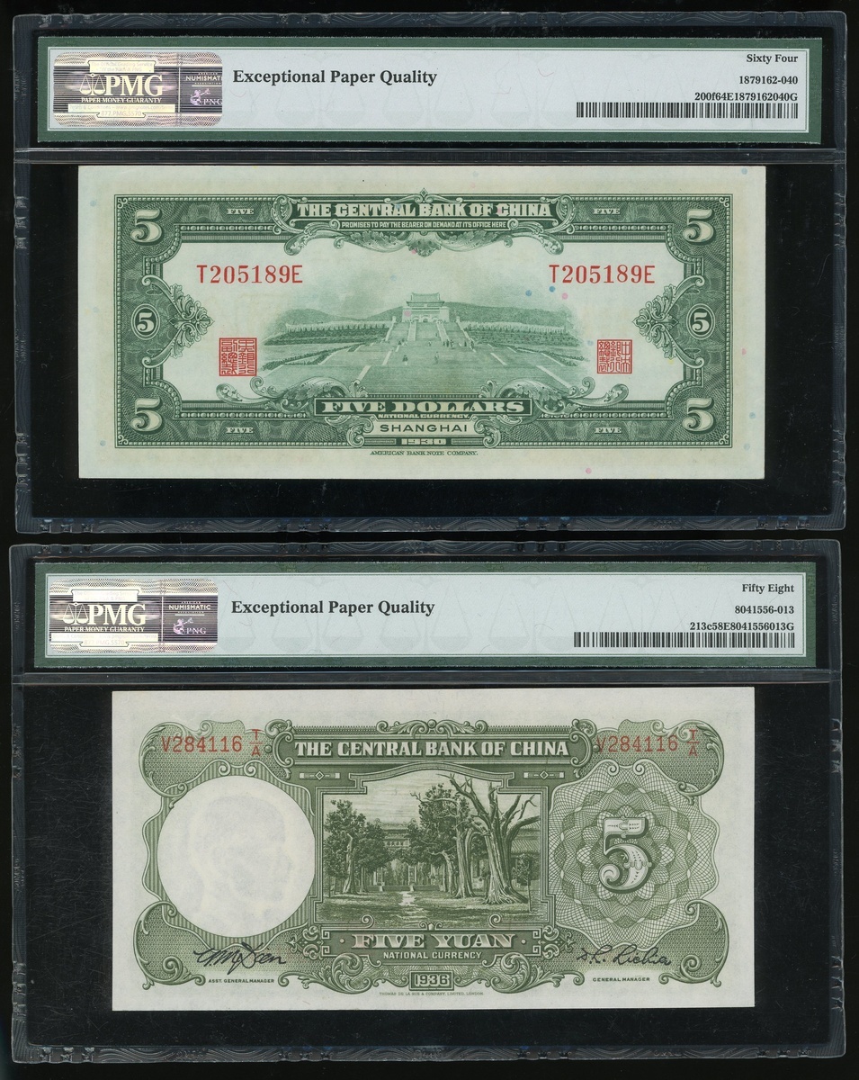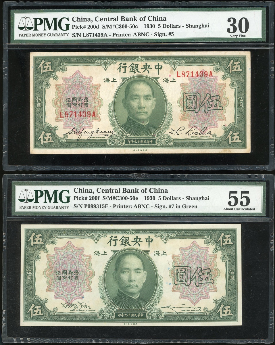 民國十九及二十五年中央銀行伍圓一組4枚,詳見圖示,PMG 30至64EPQ
