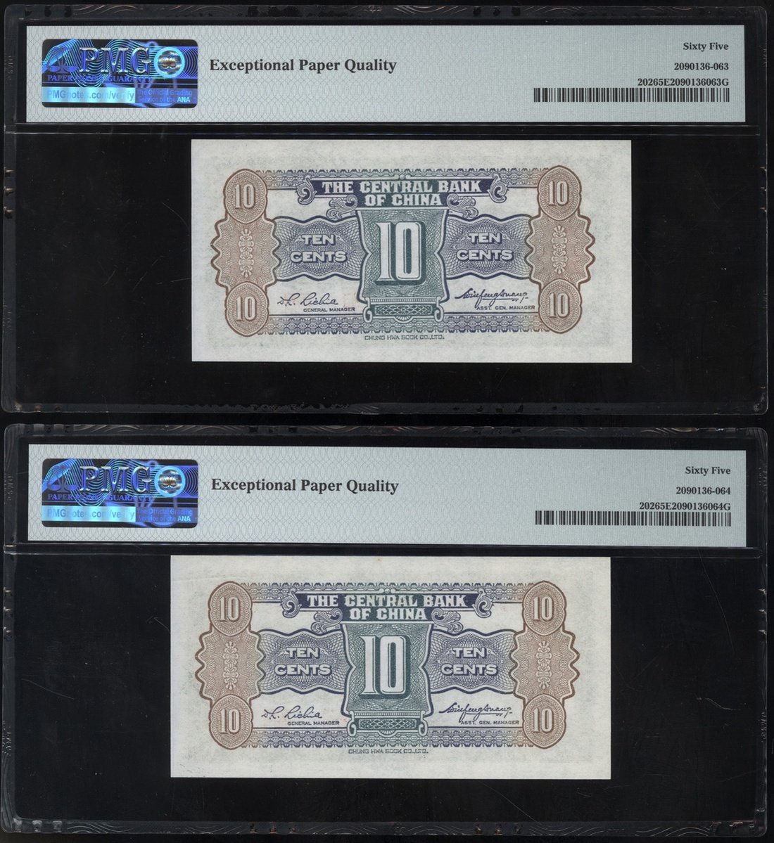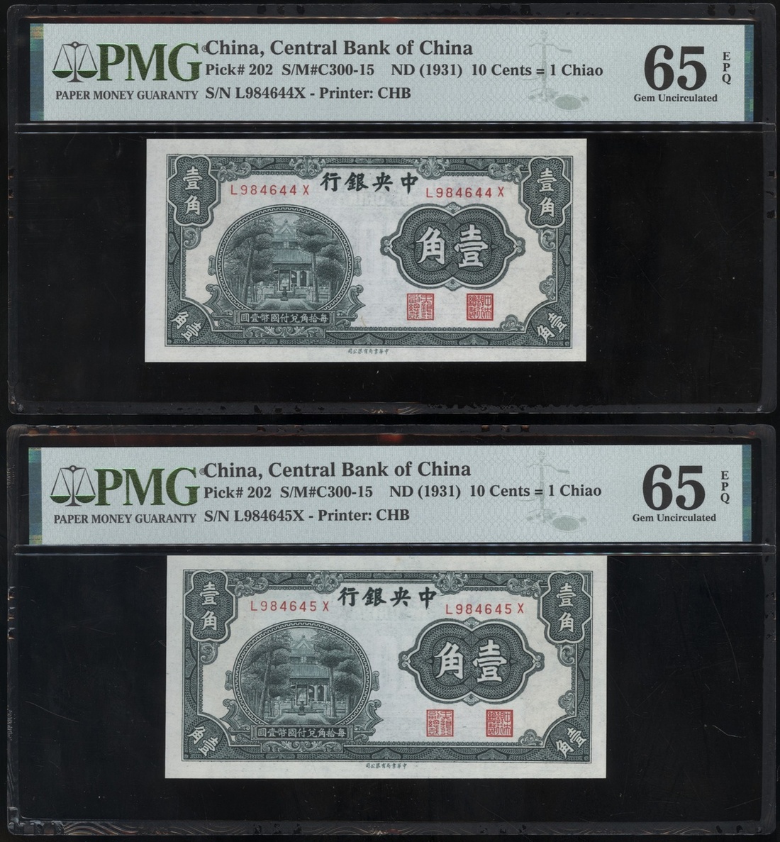 Central Bank of China, a consecutive pair of 10 cents, ND(1931), serial numbers L984644X-45X, (Pick 202), both graded PMG 65EPQ Gem Uncirculated (2)