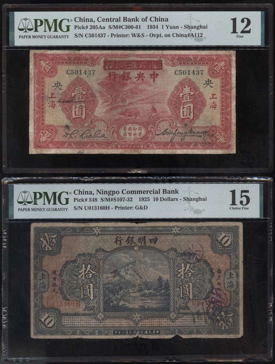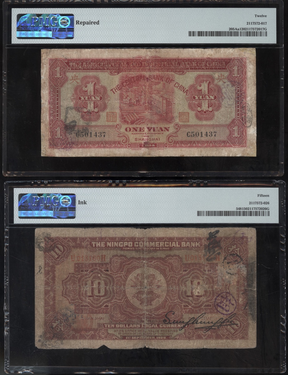 民國時期紙幣一組兩枚,民國二十三年中央銀行壹圓,上海地名,編號C501437及民國十四年四明銀行拾圓,上海地名,編號U01360H,均PMG 12-15,其中一枚有修補