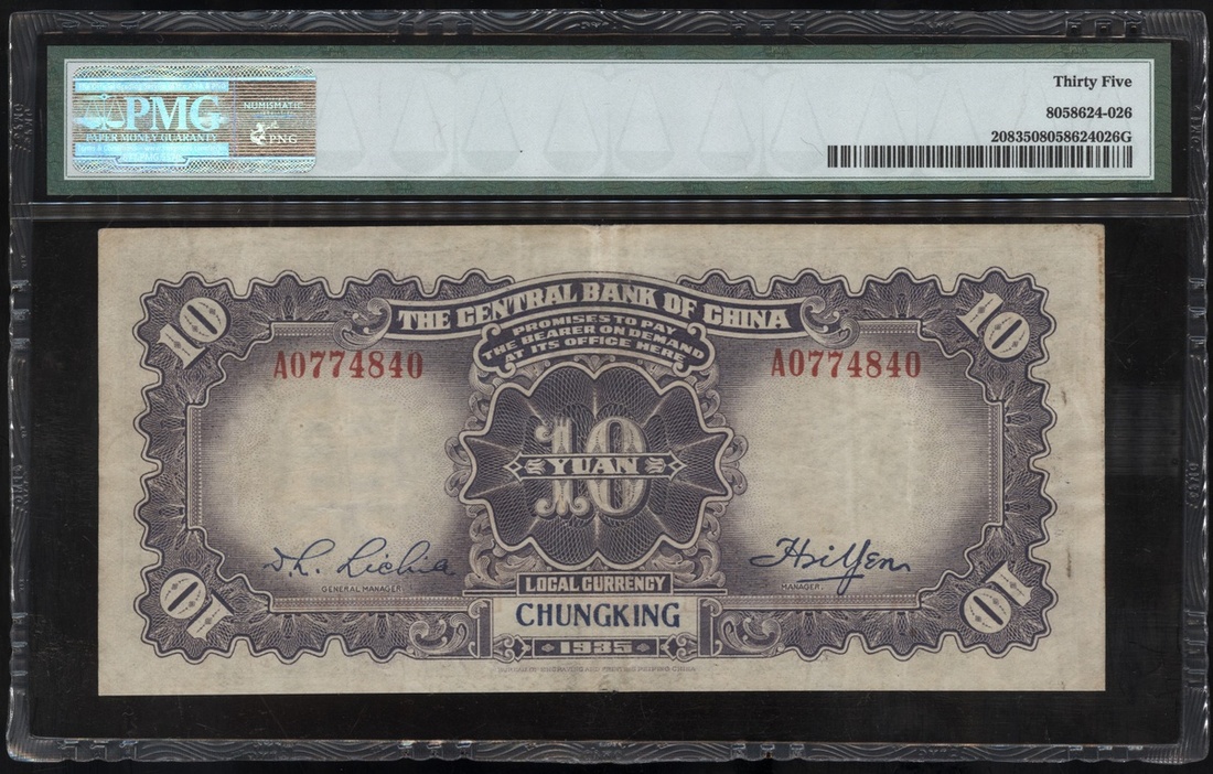 民國二十四年中央銀行拾圓,重慶地名,編號A0774840,PMG 35