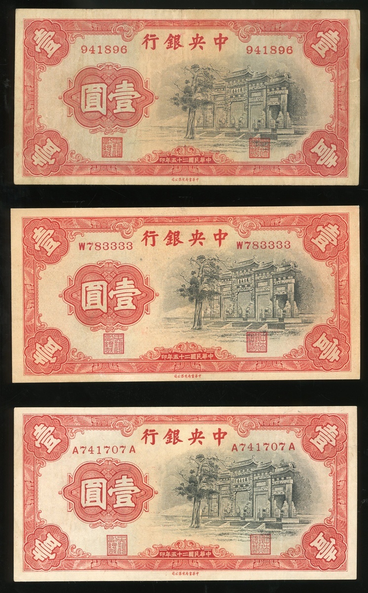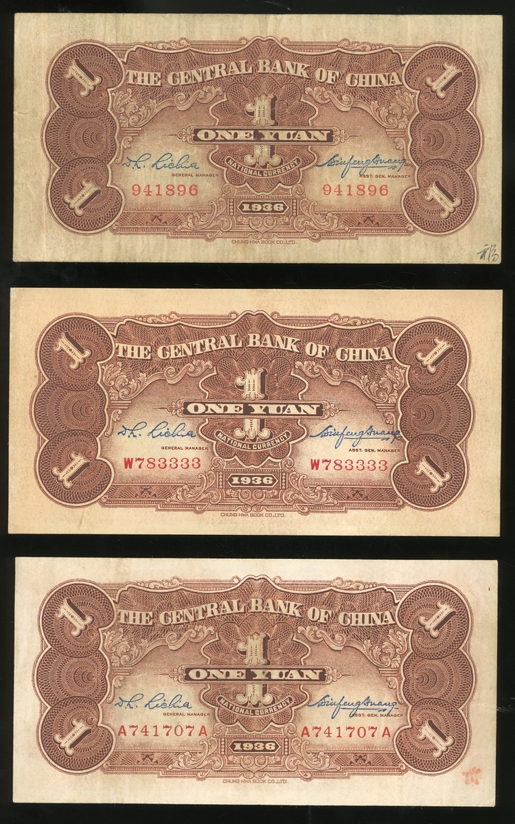 Central Bank of China, a group of 3x 1 yuan, Year 25(1936), three different prefix types: without prefix 941896, single prefix W783333 and double prefix A741707A, (Pick 210), good very fine or so (3).