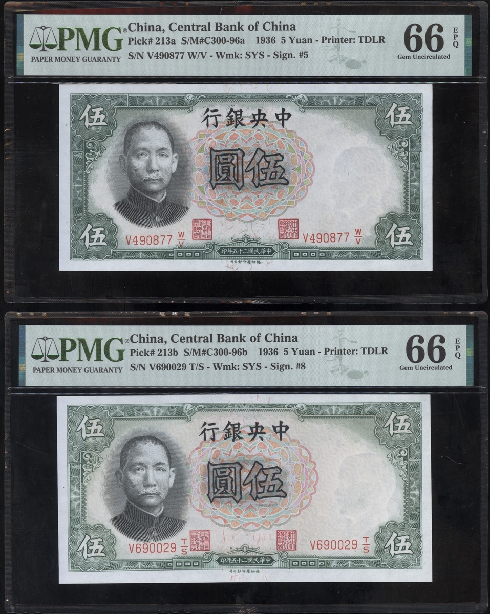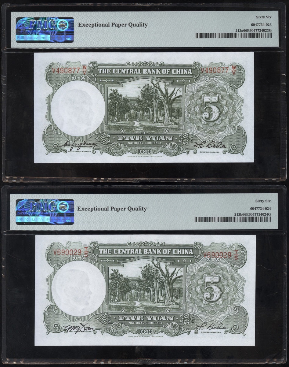 民國二十五年中央銀行伍圓一組兩枚,編號V490877W/V及V690029T/S,均PMG 66EPQ