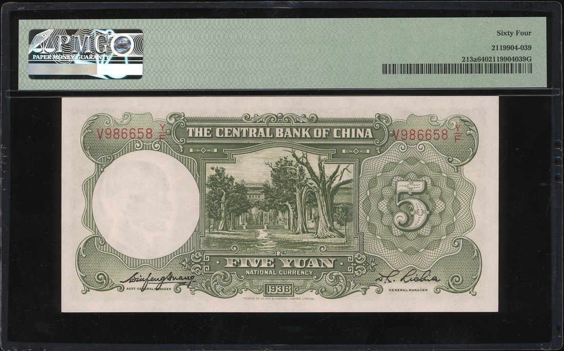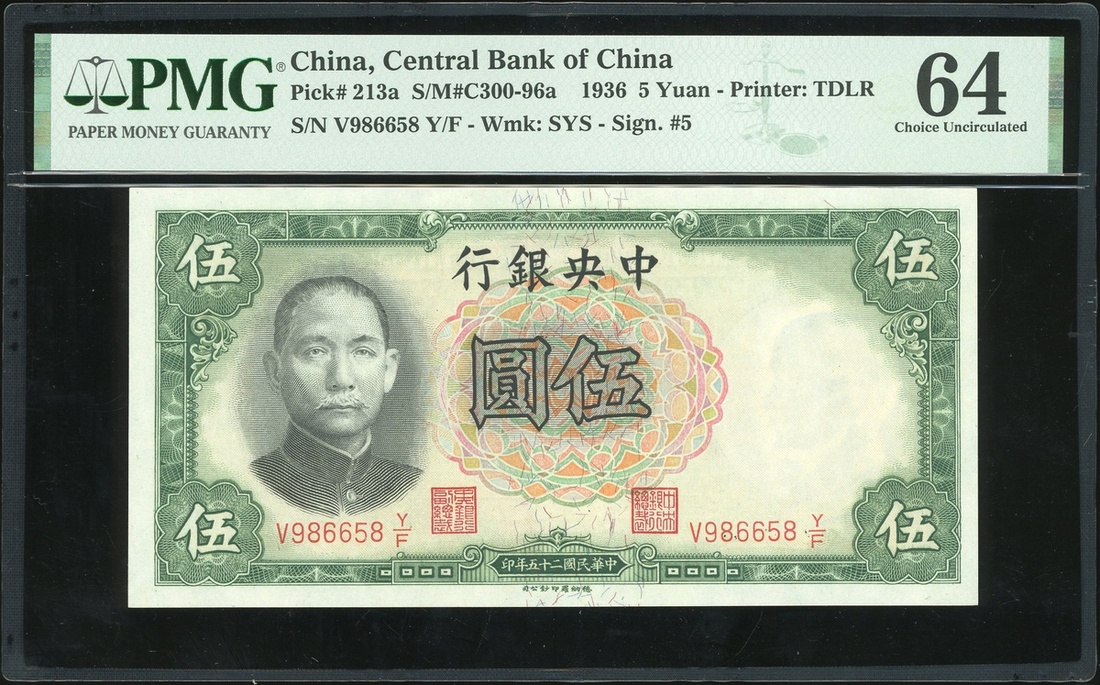Central Bank of China, 5 yuan, 1936, serial number V986658Y/F, (Pick 213a), PMG 64 Choice Uncirculated