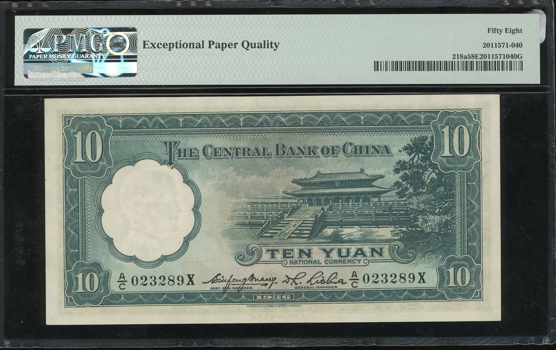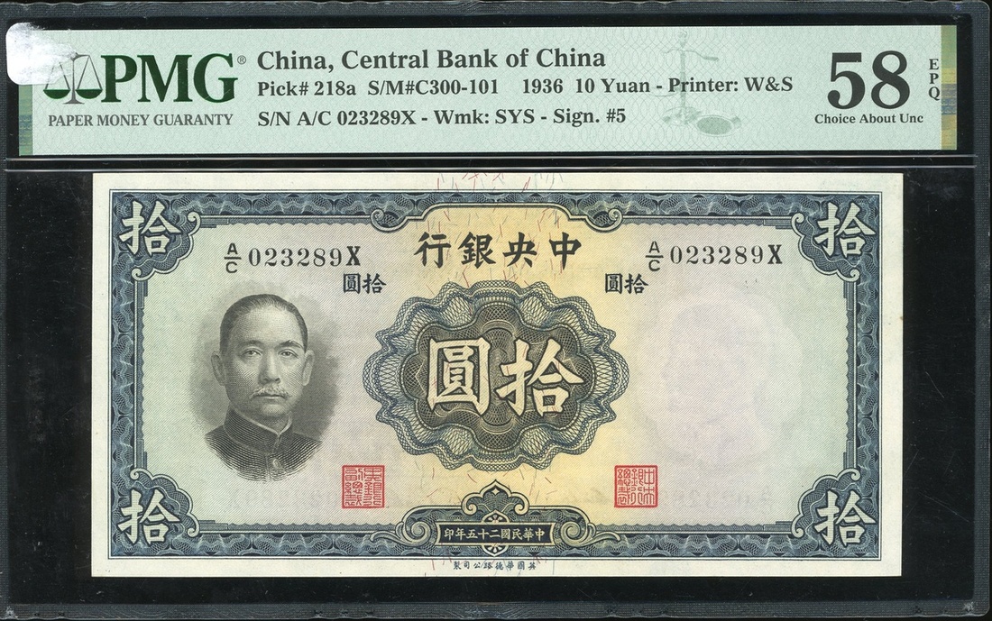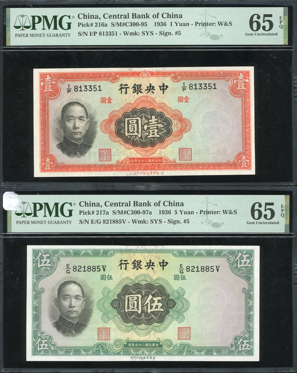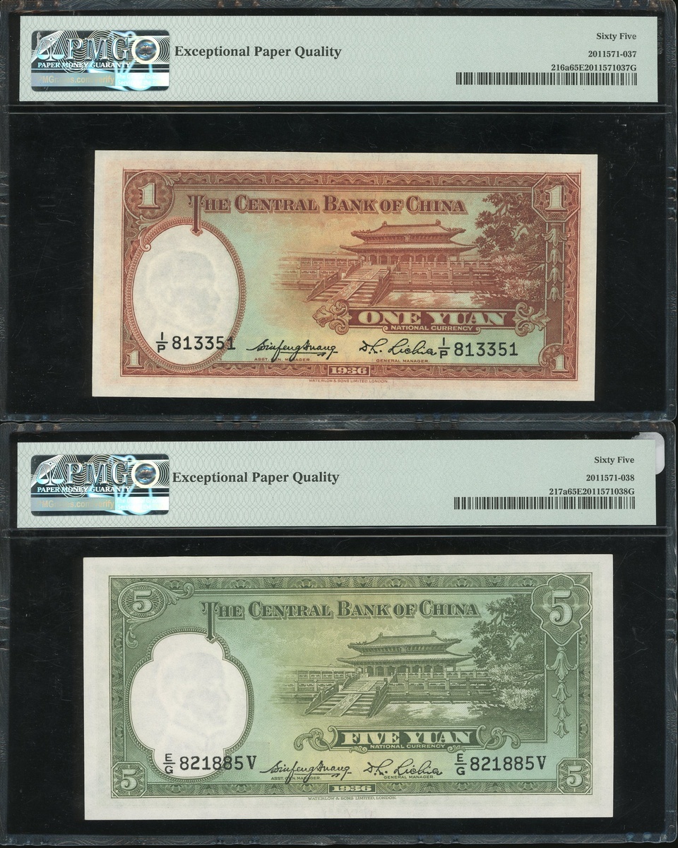 民國二十五年(1936)中央銀行,一組3枚,壹圓,伍圓及拾圓,編號I/P 813351,E/G 821885V,A/C023289X,英國華德路公司印製,分別評PMG 65EPQ,PMG 65EPQ及PMG 58EPQ