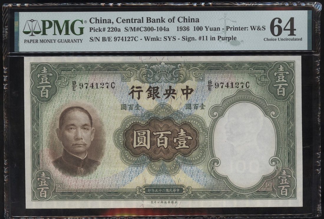 Central Bank of China, 100 Yuan, 1936, serial number B/E974127C, olive green and multicoloured, Sun Yat-sen at left, (Pick 220a), PMG 64 Choice Uncirculated