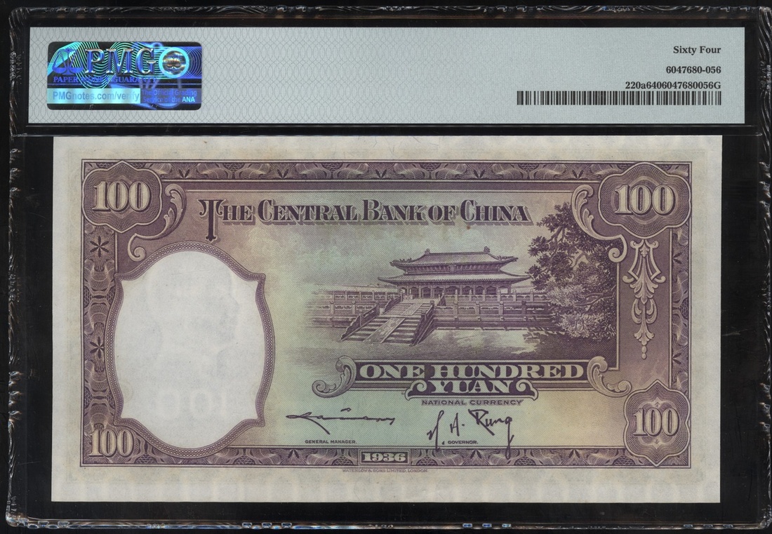 民國二十五年中央銀行壹佰圓,編號B/E974127C,PMG 64