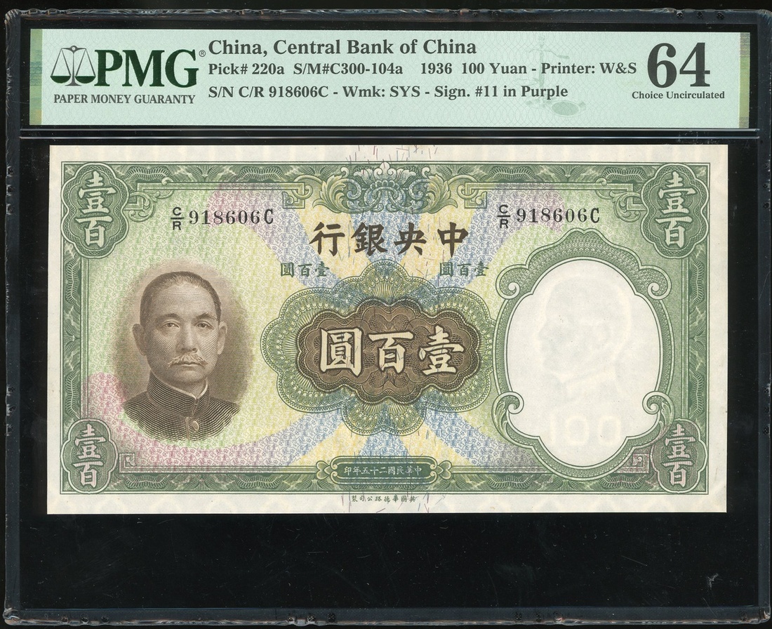 Central Bank of China, 100 yuan, Year 25(1936), serial number C/R 918606C, (Pick 220a), PMG 64 Choice Uncirculated