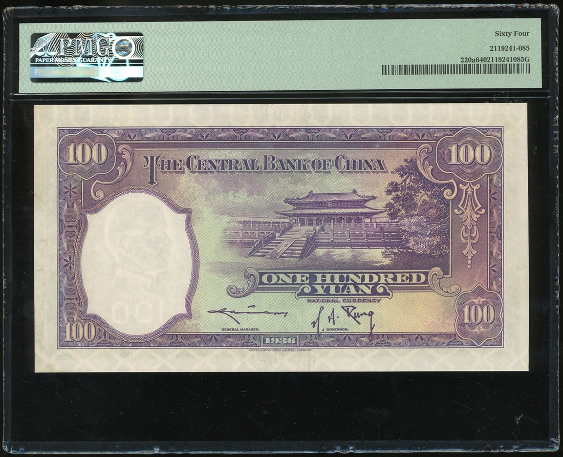 民國二十五年(1936)中央銀行壹佰圓,編號 C/R 918606C,PMG 64
