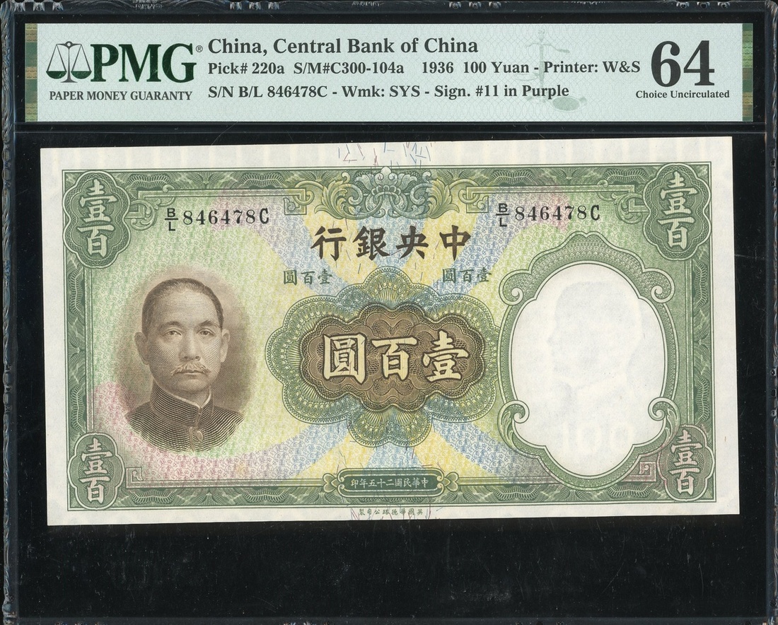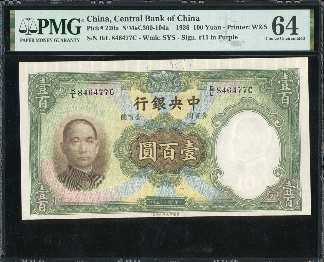 Central Bank of China, a consecutive pair of 100 yuan, 1936, serial number B/L 846477-8C, (Pick 220a), both graded PMG 64 Choice Uncirculated (2)