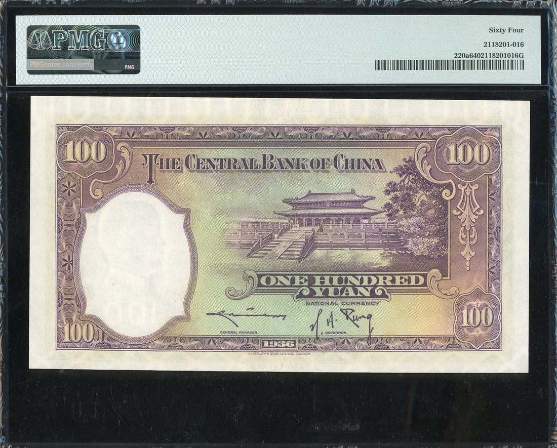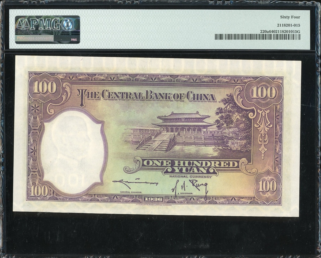 民國二十五年(1936)中央銀行壹佰圓一對,編號B/L 846477-8C,均評PMG 64