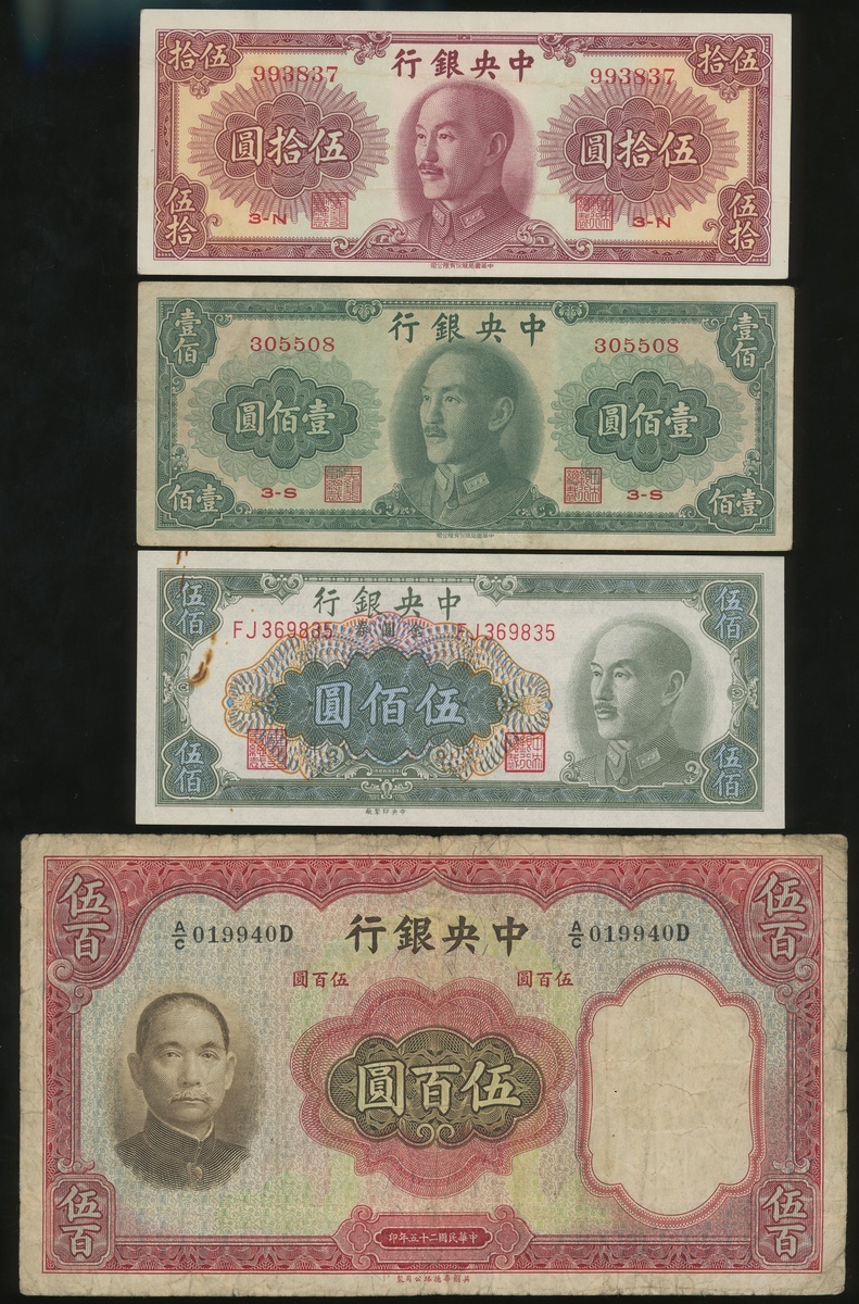 民國三十至四十年代中央銀行紙鈔一組11枚,包括民國二十五年(1936)伍佰圓,編號A/C 019940D,品相不一,F-EF品相,敬請預覧
