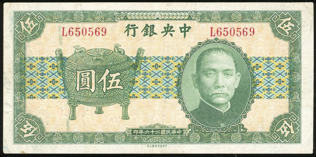民國二十六年(1937)中央銀行伍圓,編號L650569,EF品相,輕壓有黃