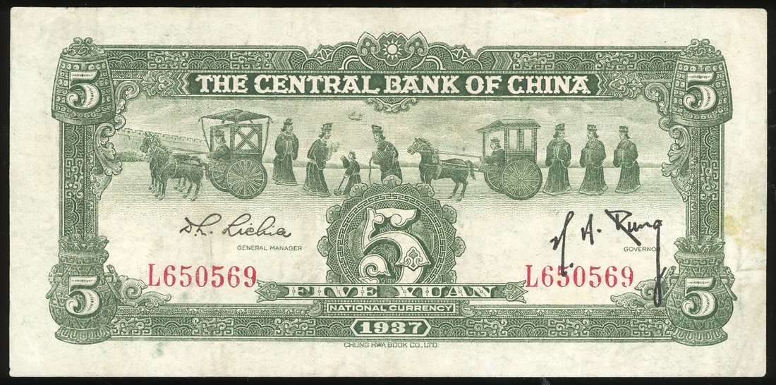 Central Bank of China, 5 yuan, Year 26 (1937), serial number L650569, (Pick 222), lightly pressed about extremely fine, mild toning