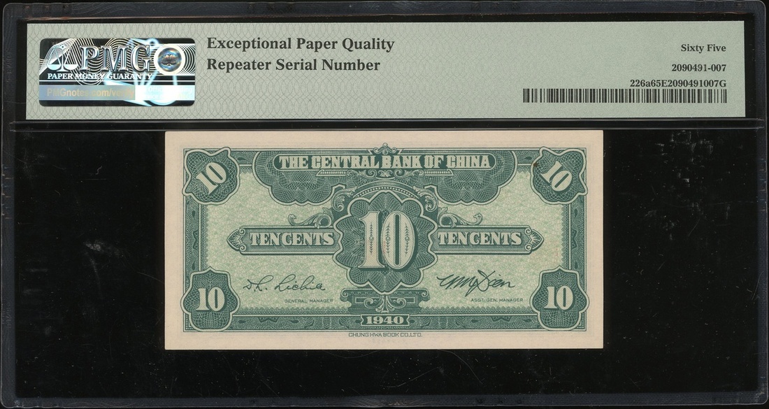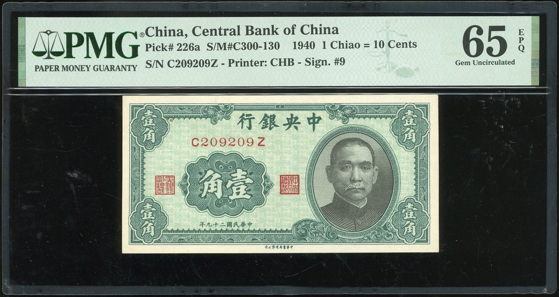 Central Bank of China, 10 cents, Year 29(1940), repeater serial number C209209Z, (Pick 226a), PMG 65EPQ Gem Uncirculated