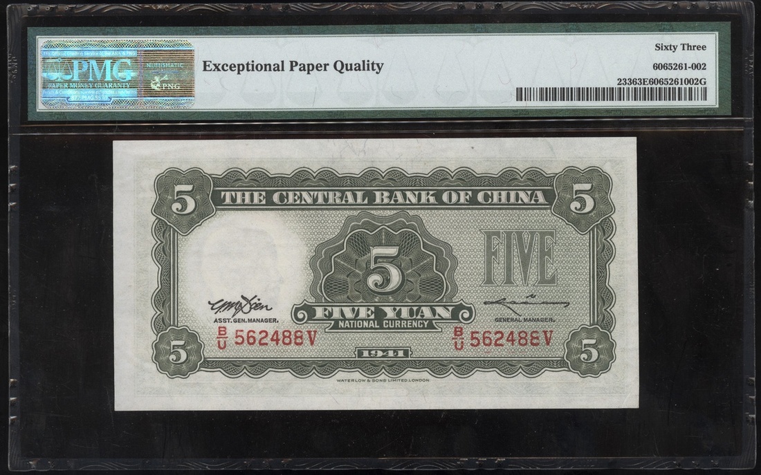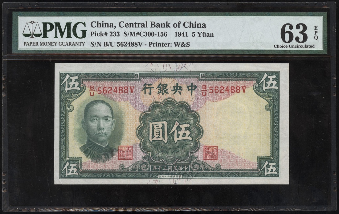 民國三十年中央銀行伍圓,編號B/U562488V,PMG 63EPQ