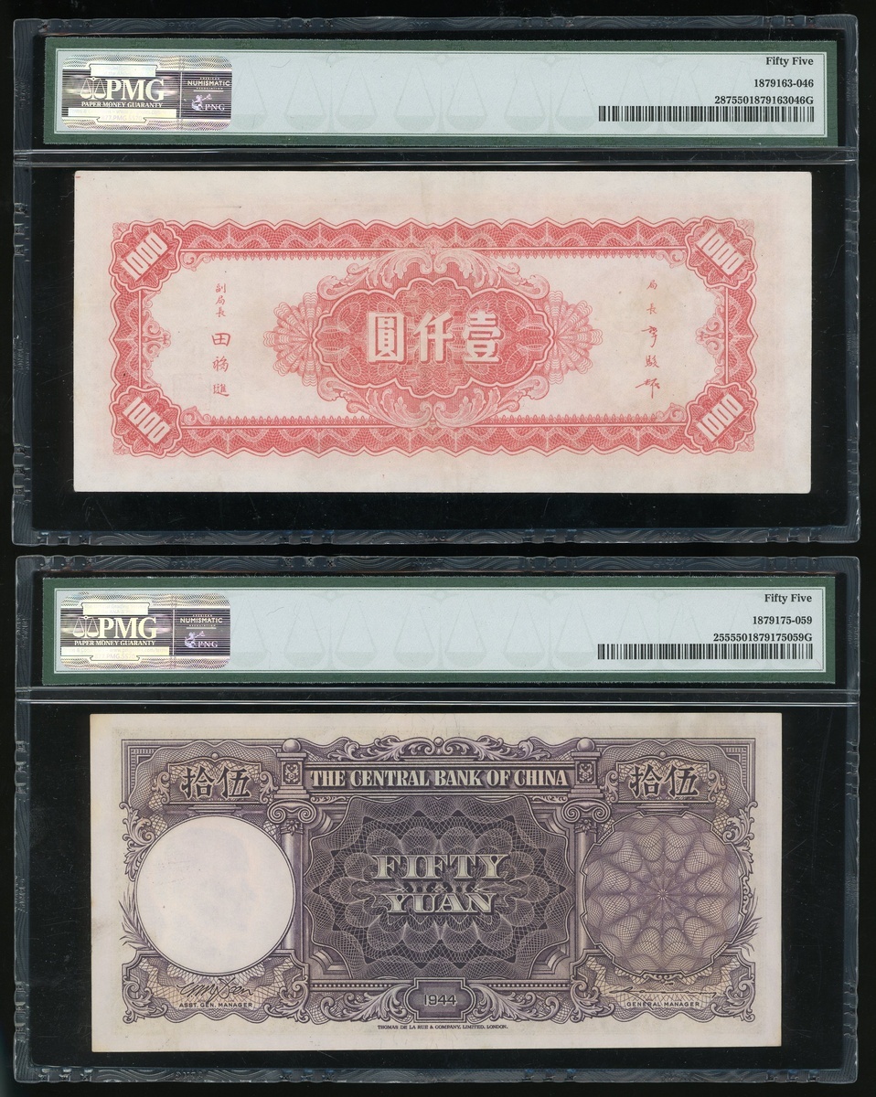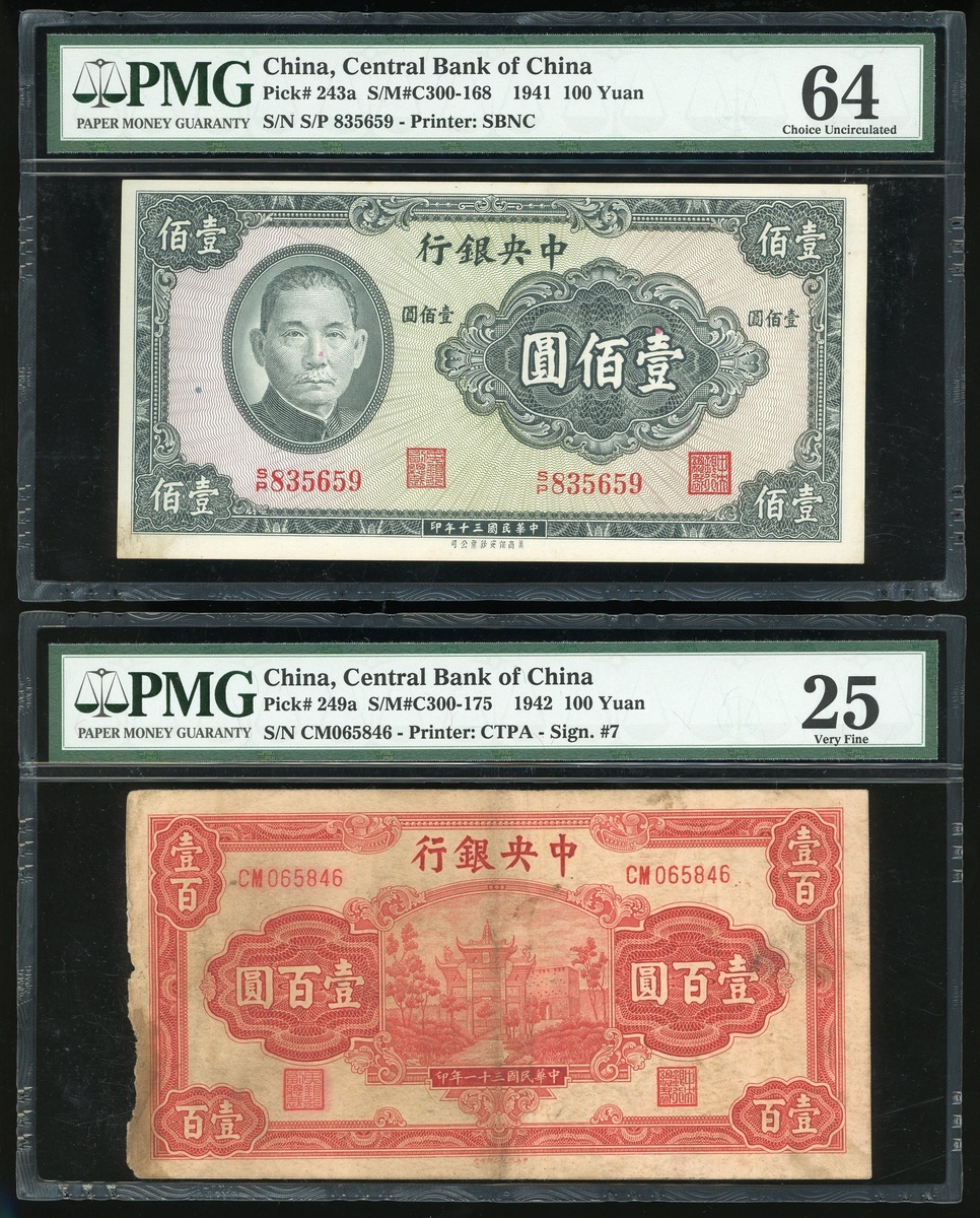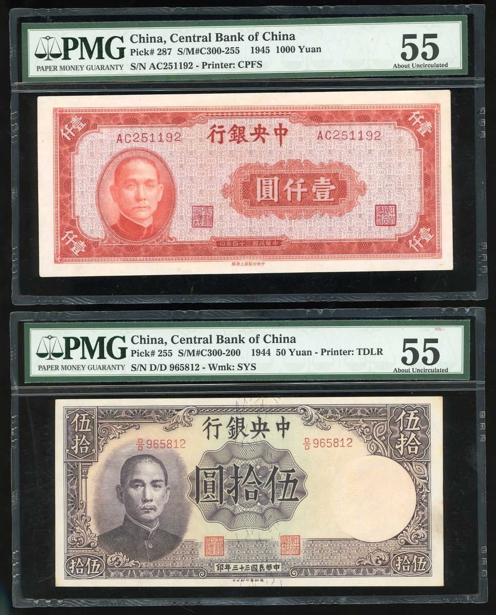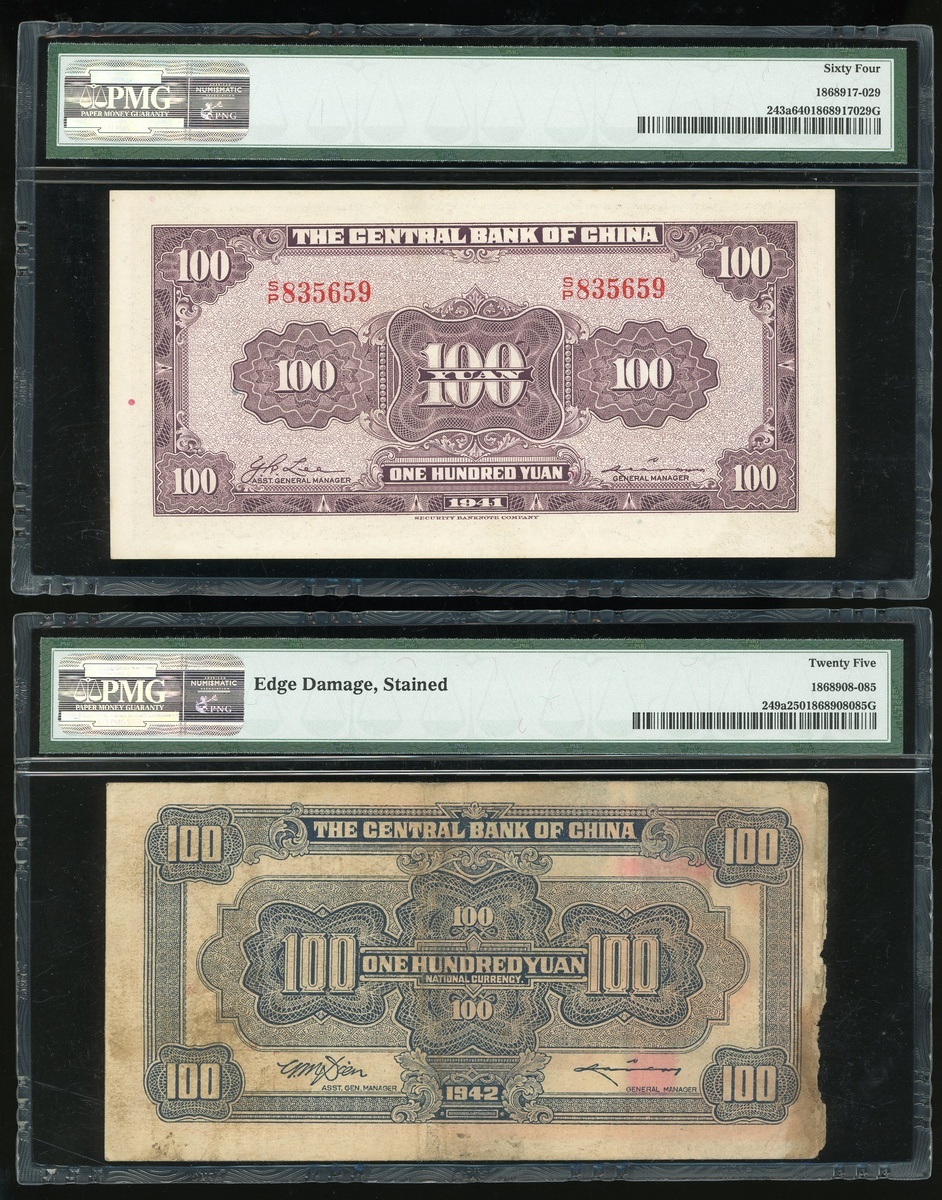 Central Bank of China, a group of 4 notes, consists of 2x 100 Yuan, 1941 and 1942, serial numbers S/P835659 and CM065846, grey and red respectively, 50 and 1000 Yuan, 1944 and 1945, serial numbers D/D965812 and AC251192, purple and red respectively, Sun Yat-sen at left, (Pick 243a, 249a), (Pick 255, 287), PMG 25 (Edge Damage, Stains)-64 Choice Uncirculated (2) PMG 55 About Uncirculated (2)