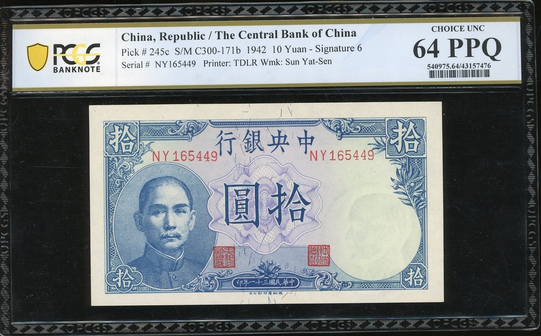 民國三十一年中央銀行拾圓,編號NY165448,PCGS Banknote 64PPQ