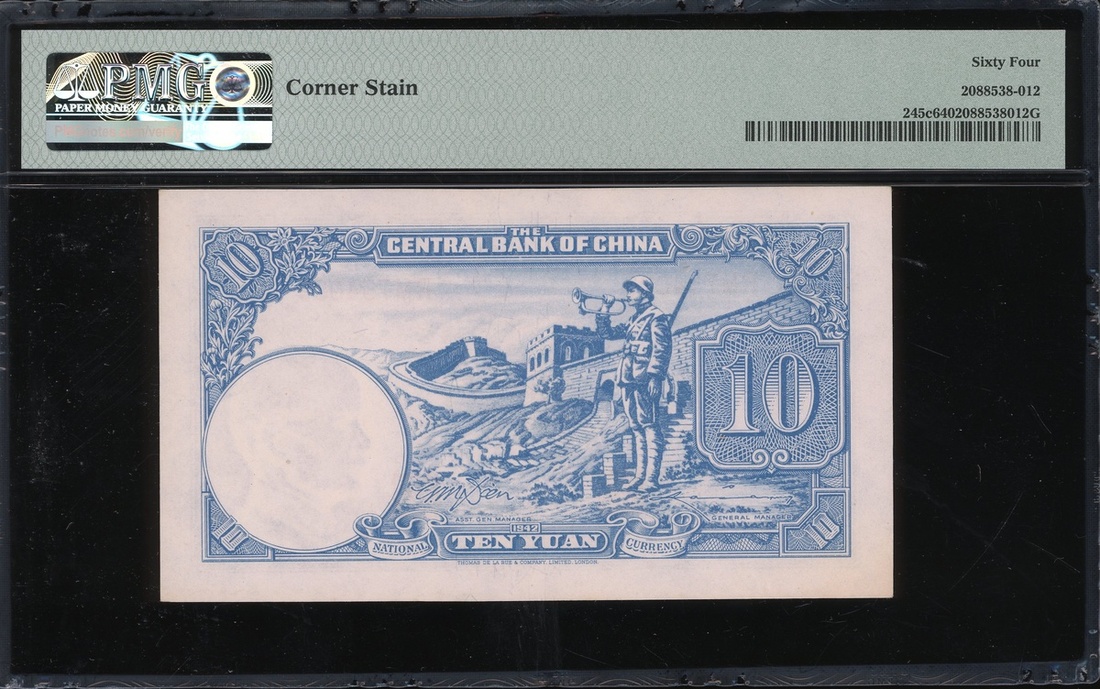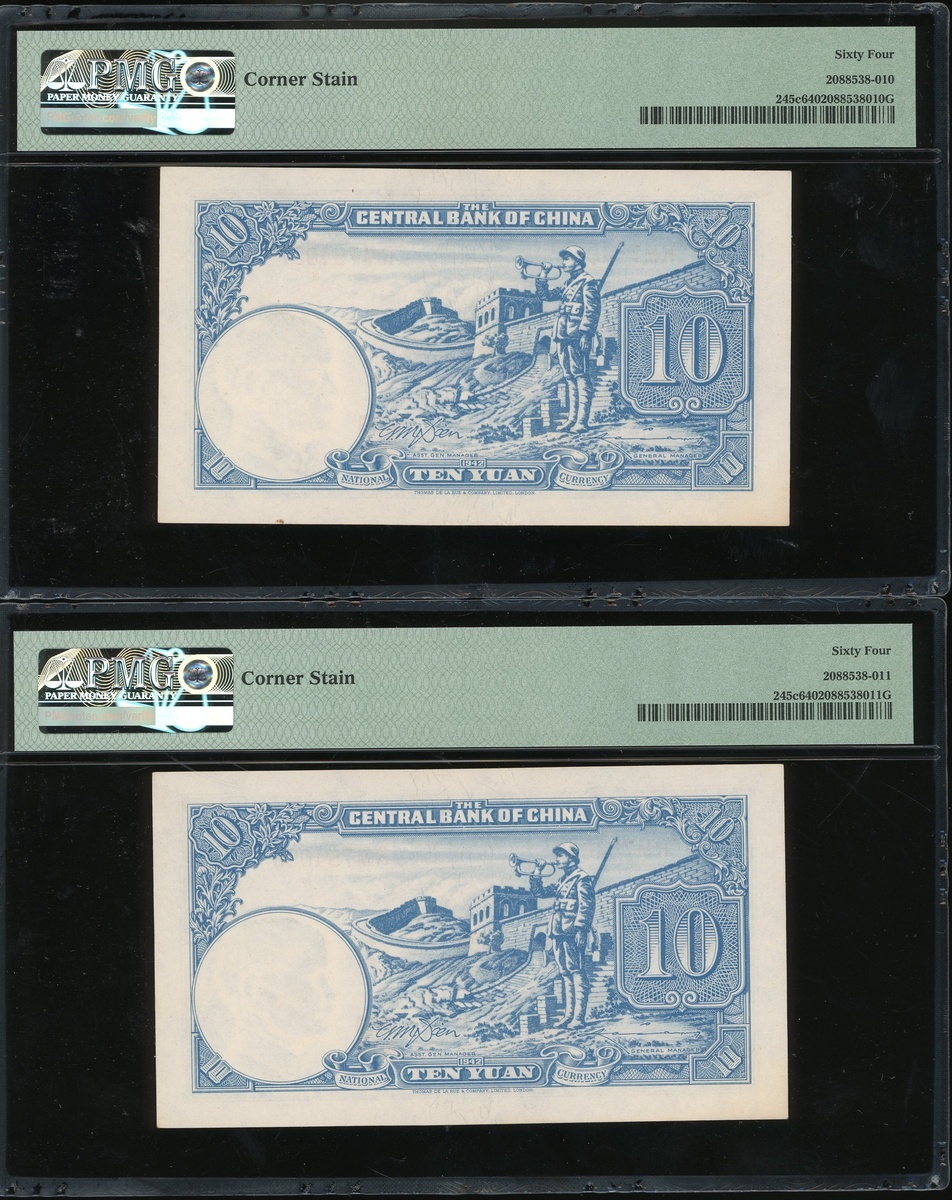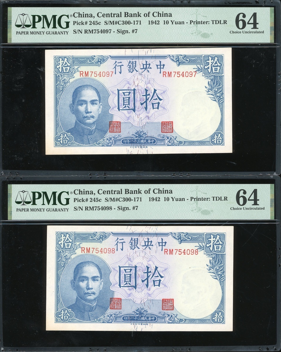 The Central Bank of China, 10 Yuan, Year 31 (1942), consecutive run of 3, serial numbers RM754097-099, (Pick 245c), all graded PMG 64 Choice Uncirculated (Corner Stain) (3)
