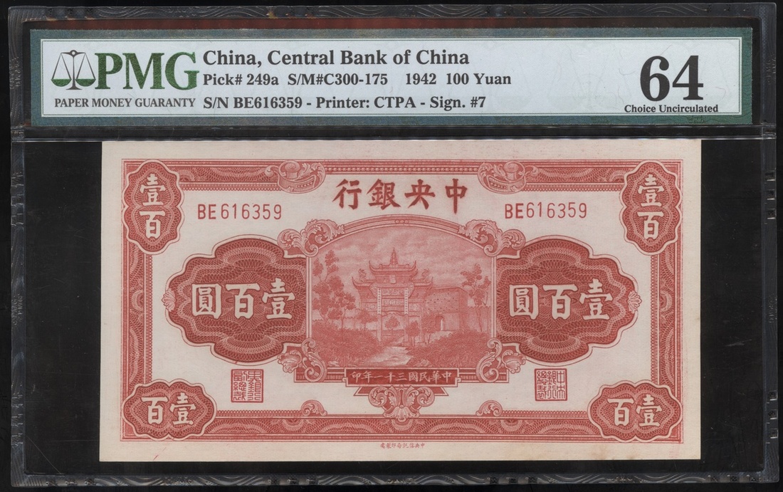 Central Bank of China, 100 Yuan, 1942, serial number BE616359, red and white, gateway at centre, (Pick 249a), PMG 64 Choice Uncirculated