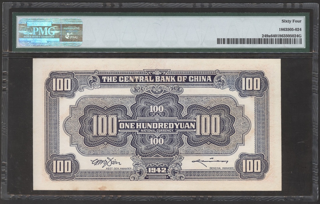 民國三十一年中央銀行壹佰圓,編號BE616359,PMG 64