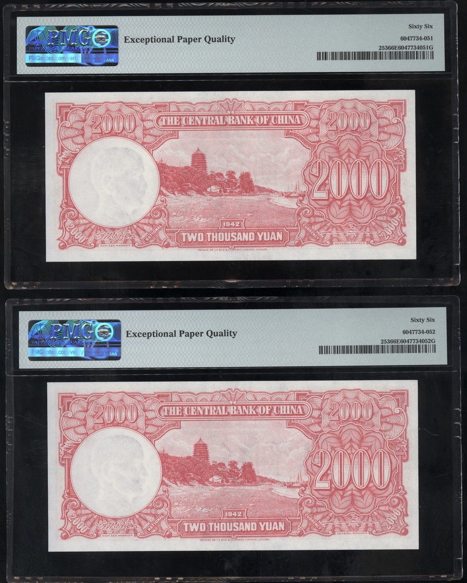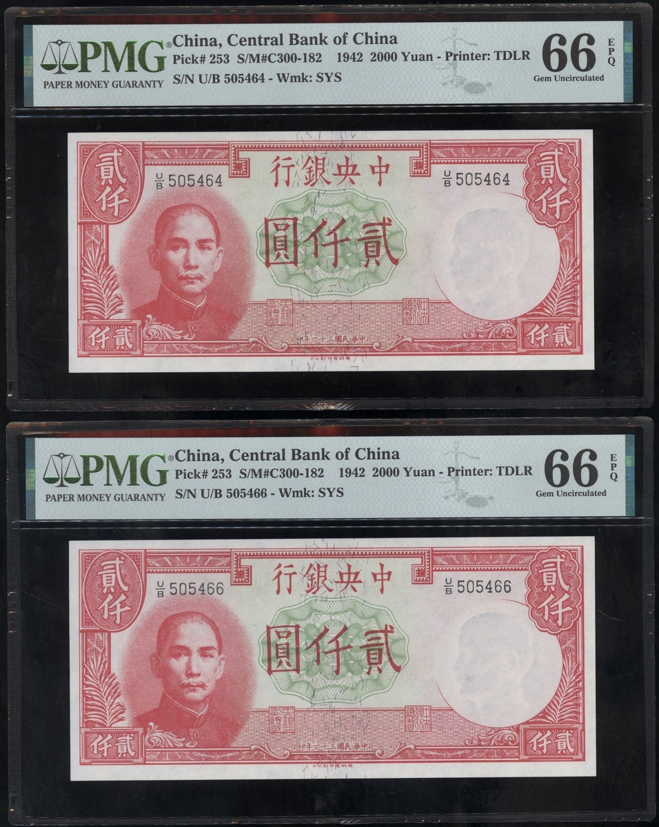 民國三十一年中央銀行貳仟圓一組兩枚,編號U/B505464及U/B505466,均PMG 66EPQ