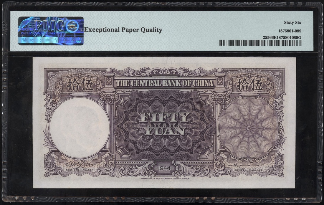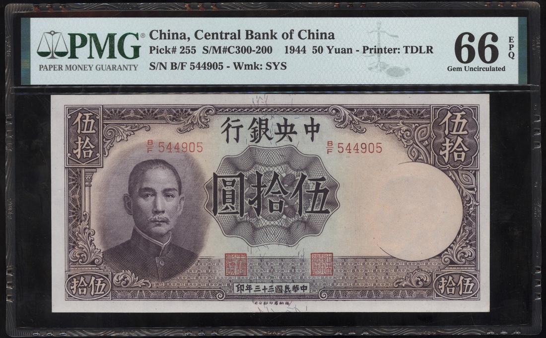 民國三十三年中央銀行伍拾圓,編號B/F 544905,PMG 66EPQ