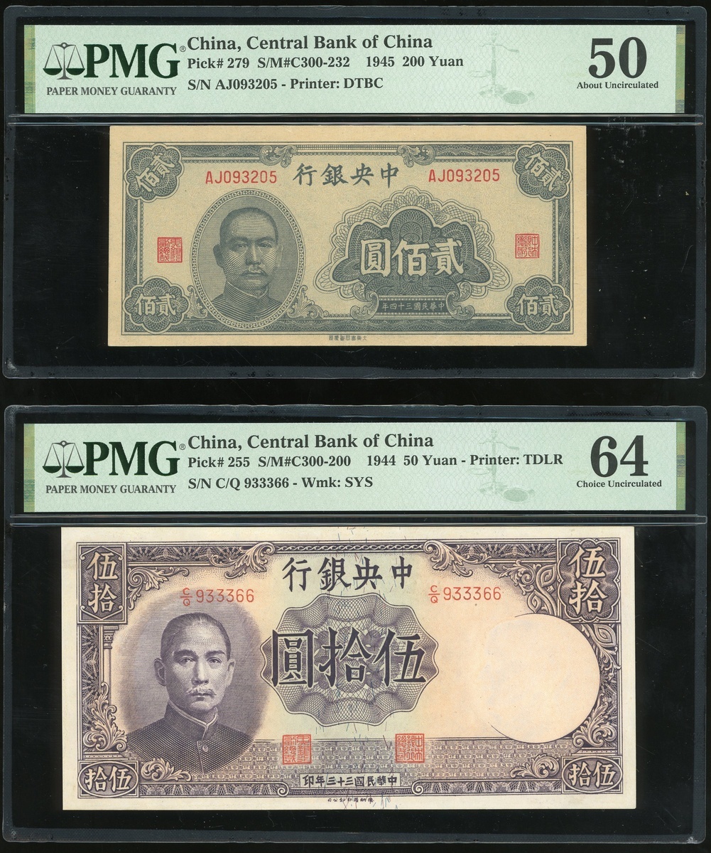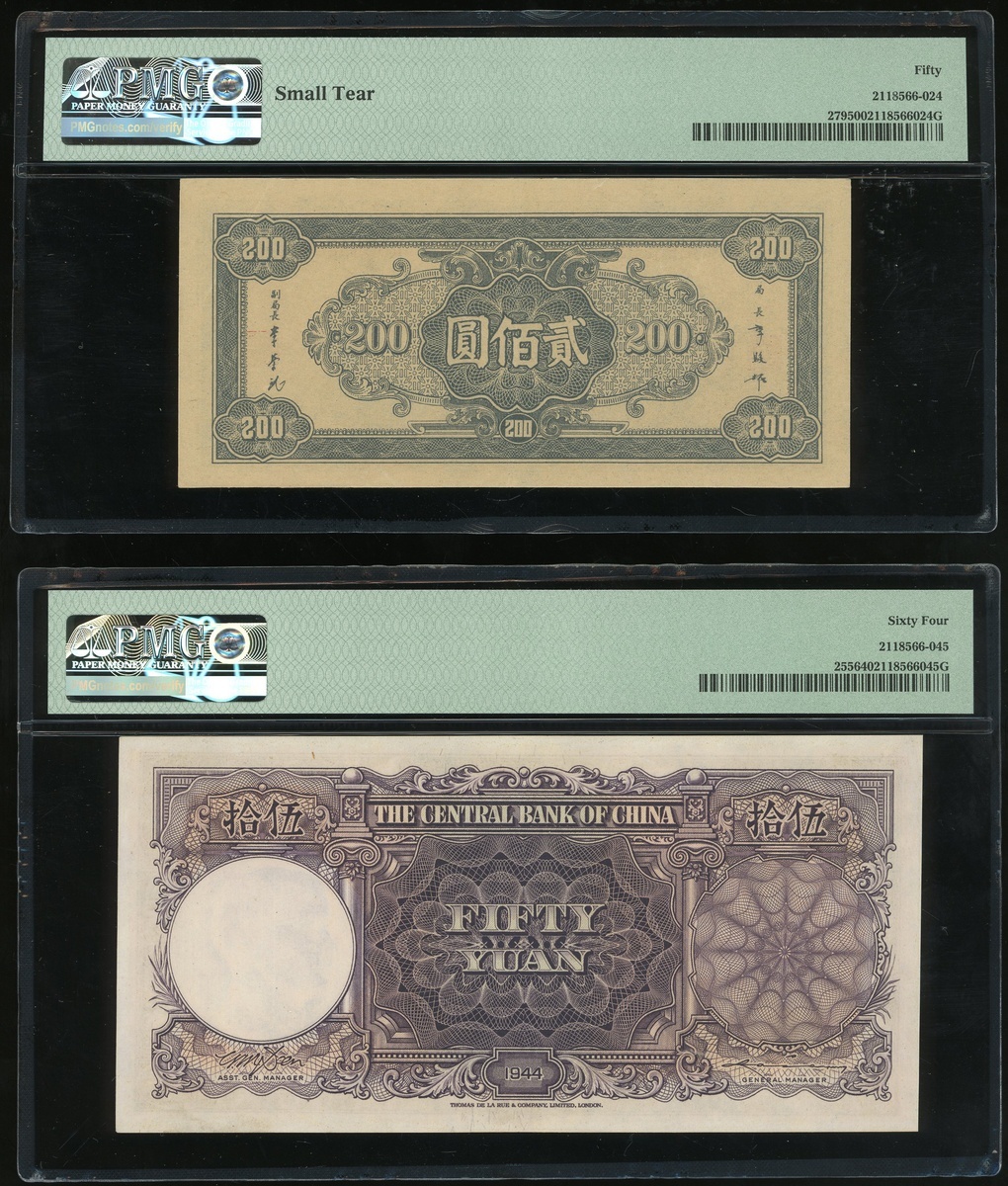 民國三十四年(1945)及三十三年(1944)中央銀行貳佰圓及伍拾圓,編號AJ093205及C/Q 933366,評PMG 50及64