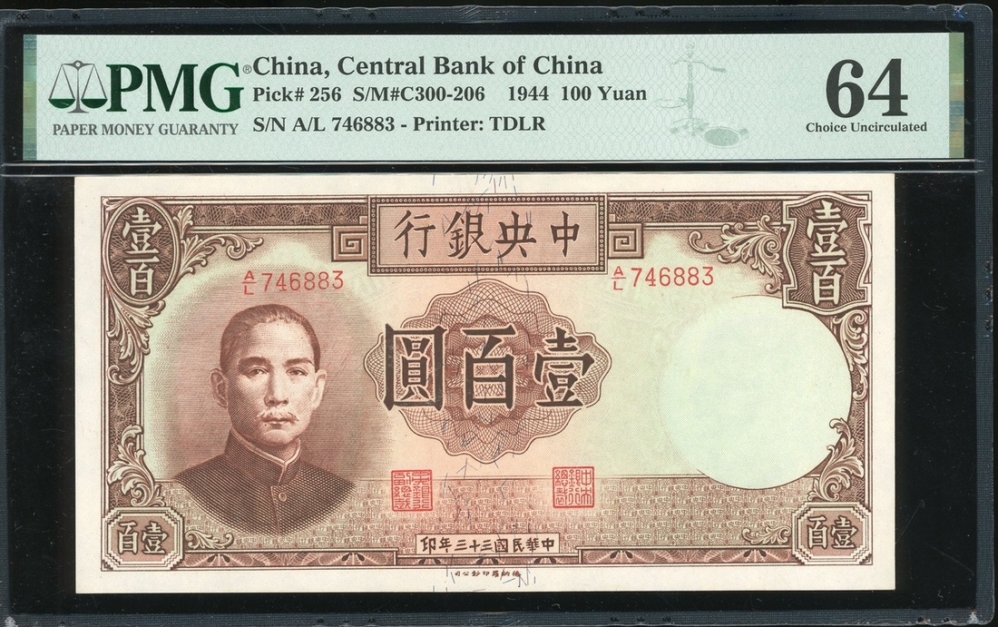 Central Bank of China, 100 yuan, 1944, serial number A/L746883, brown on light green underprint, Sun Yat Sen at left,