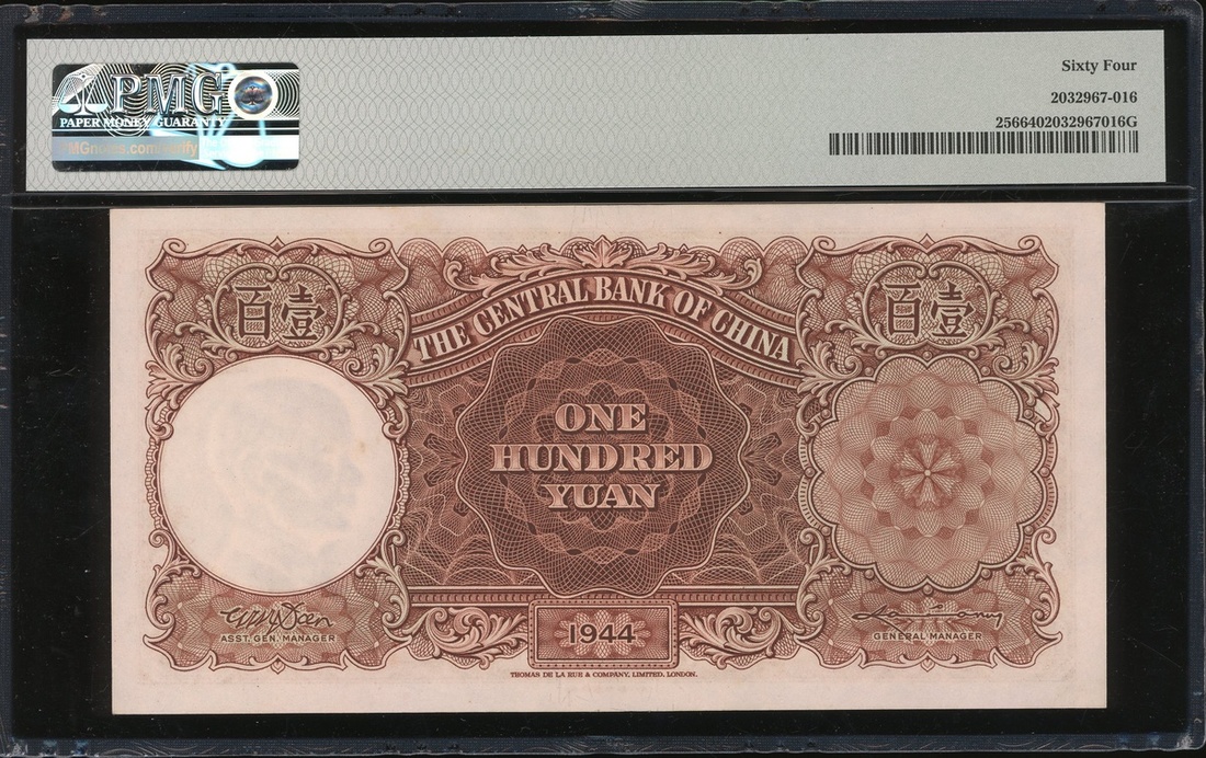 民國三十三年(1944)中央銀行壹佰圓一對,編號A/L 746883,分別評PMG 64