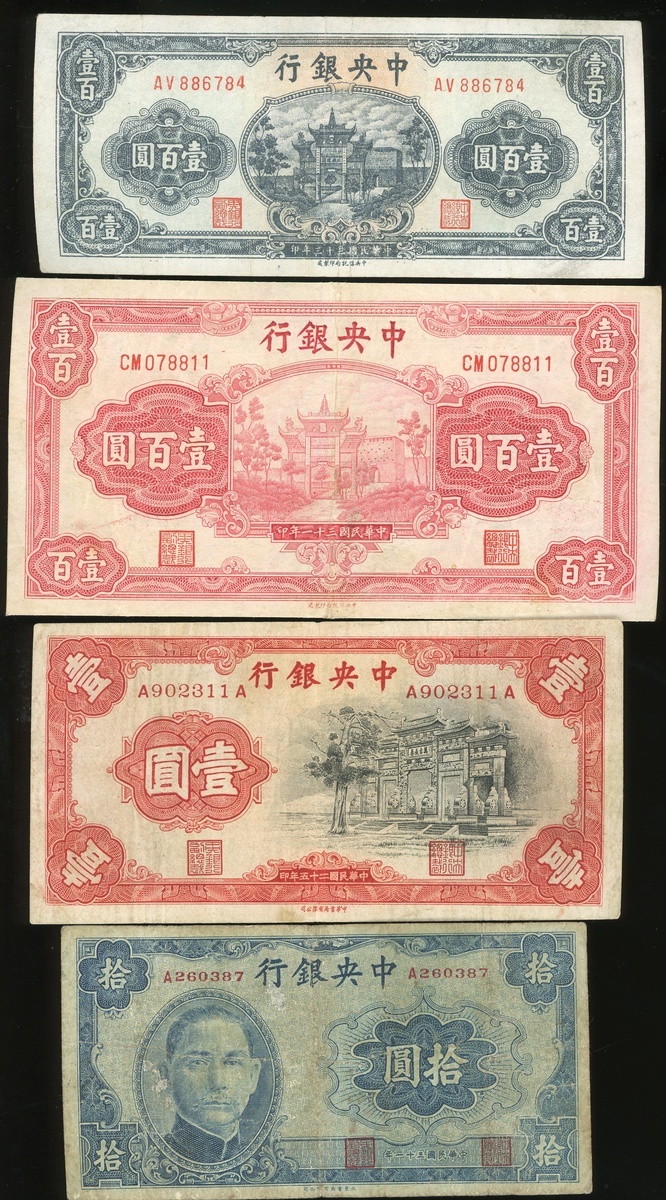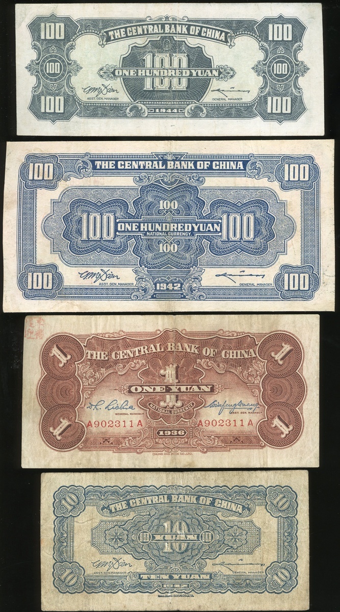 Central Bank of China, group of 3 notes consisting of: 1 yuan, 1936 #A902311A, 100 yuan, Zhong Yan Xin Tuo Printing, 1942 #CM078811, 10 yuan, Da Dong Bookshop, 1942 #A260387 and 100 yuan, 1944 #AV886784,