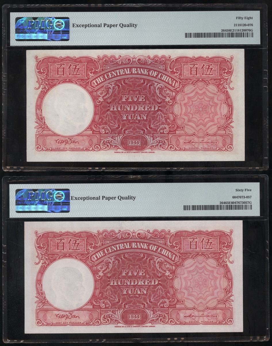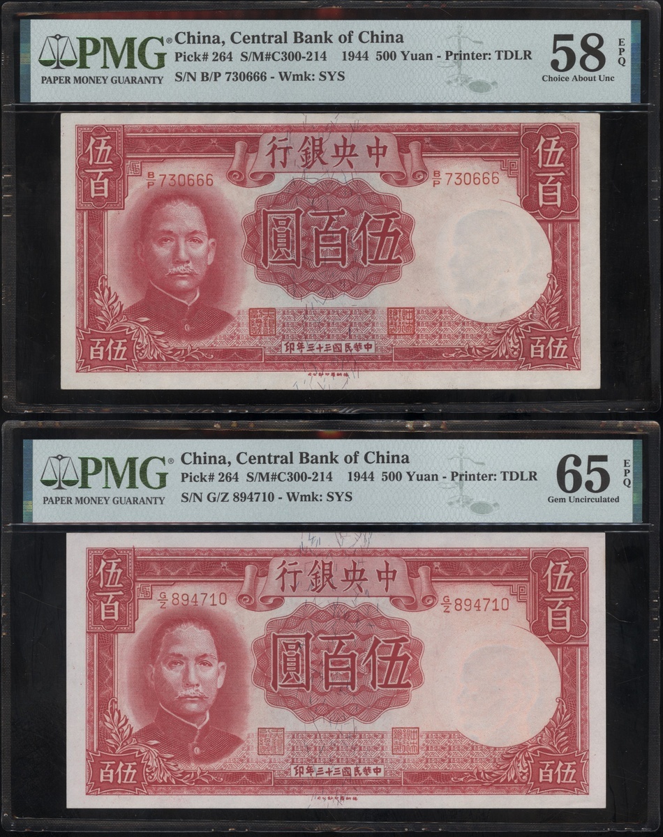 Central Bank of China, 500 Yuan, 1944, serial numbers B/P 730666 and G/Z 894710, red, Sun Yat-sen at left, (Pick 264), PMG 58EPQ Choice About Uncirculated-65EPQ Gem Uncirculated (2)