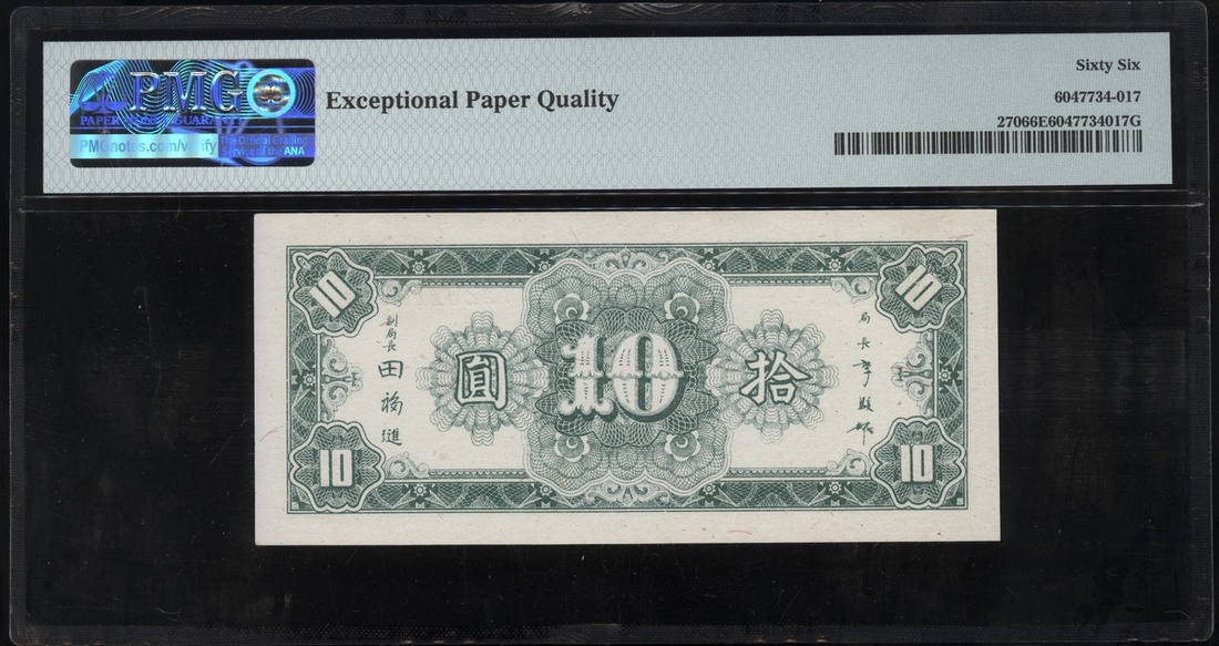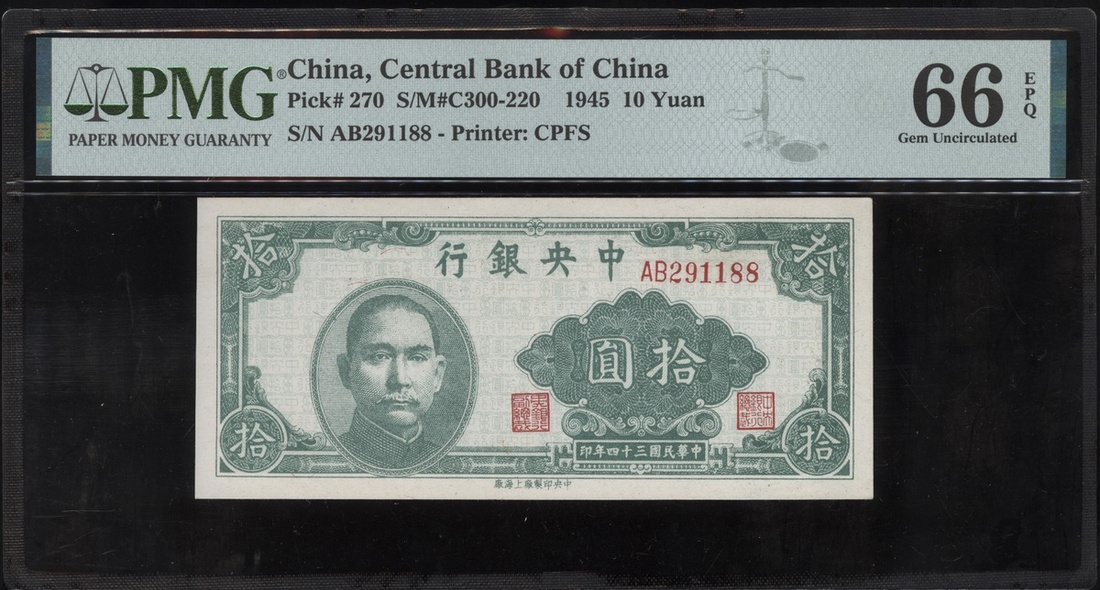 民國三十四年中央銀行拾圓,編號AB291188,PMG 66EPQ