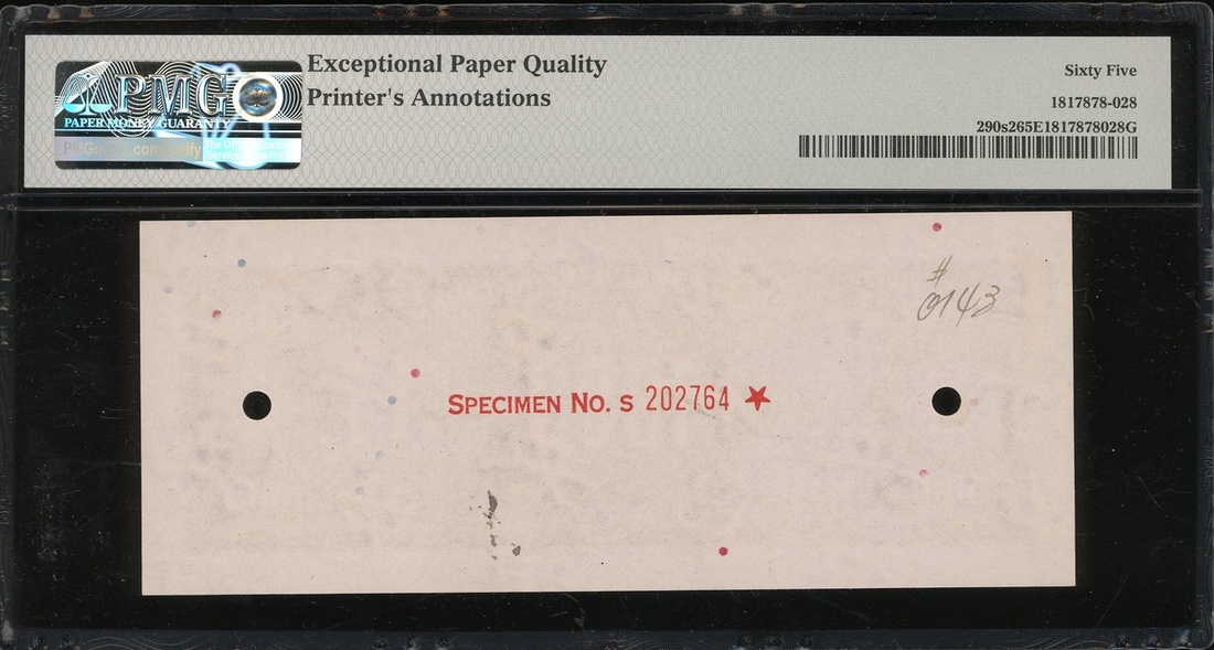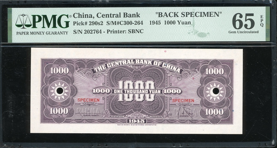 民國三十四年中央銀行壹仟圓背面樣票,編號202764,PMG 65EPQ