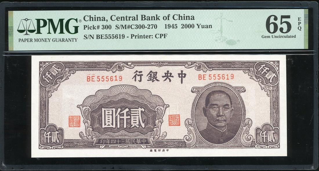 The Central Bank of China, 2000 yuan, Year 34 (1945), serial number BE555619, (Pick 300), PMG 65EPQ Gem Uncirculated, only 4 of such notes are graded higher in the PMG population report and with this note being the sole owner of this grade as of writing!