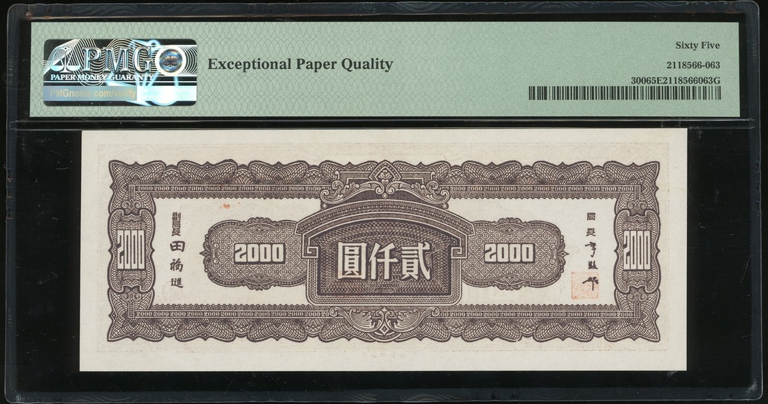 民國三十四年(1945)中央銀行貳仟圓,編號BE555619,評PMG 65EPQ,PMG紀錄中僅4枚更高分數,筆者查閱時65EPQ只此一枚